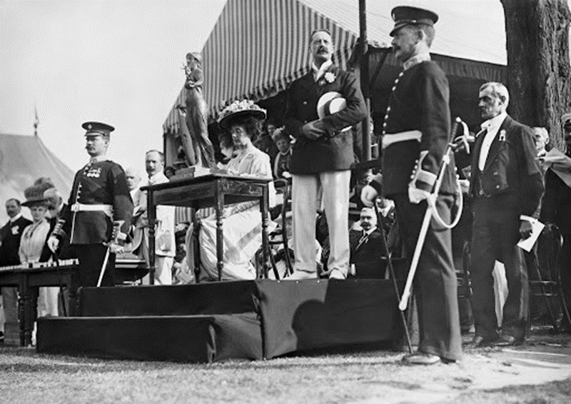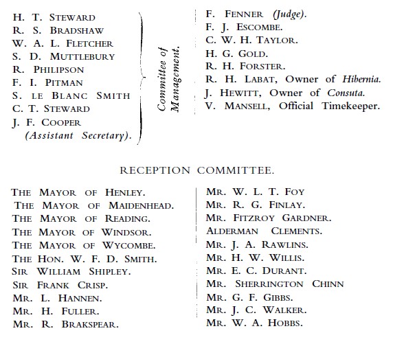 The prize-giving of the Olympic Regatta at Henley took place at a quarter to five on July 31 in the Grandstand enclosure. The drums and bugles of the Irish Guards, who had added so much to the picturesqueness of the Queen’s prize-giving in the Stadium, came down to Henley for this occasion also. Lord Desborough, President of the British Olympic Council, and member of the International Olympic Committee, opened the proceedings with a short speech. The winners of the Sculls, Pairs, Fours, and Eights then advanced, in that order, to receive their Gold Medals from Lady Desborough, their prize diplomas from Mr. F. I. Pitman and Mr. S. Le B. Smith, their club diplomas from Mr. H. T. Steward and Mr. C. T. Steward, and the Silver Oars from Mrs. W. Anker Simmons and her husband, the Mayor of Henley, assisted by Mr. L. Hannen. Afterwards, all the competitors, other than winners, received the Olympic Commemoration Medals from Mr. W. A. L. Fletcher, in the absence of Comte Brunetta d’Usseaux, who was unfortunately prevented from taking part in a ceremony to which his challenge prize had added so much distinction. At the end, the following gentlemen, together with the Reception Committee, who had all worked together to promote the success of the Regatta, were presented with Commemorative Medals by Baron Pierre de Coubertin, President of the International Olympic Committee, and Mr. R. G. Gridley, Hon. Secretary of the Amateur Rowing Association, and member of the British Olympic Council: –