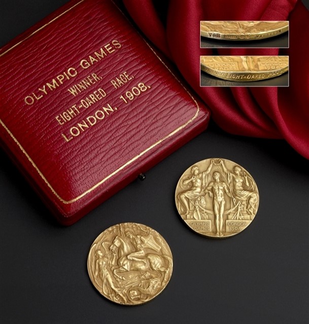 The Official Report on the Games gives details (on page 37) of the rowing events (all men’s): Sculls, Pairs, Fours, and Eights. In addition, it gives the closing dates for entries and states that the maximum number of competitors from each county shall be two. Racing in Henley would be “on July 28, 1908 and following days.” Most importantly, it gives details of the prizes offered:
