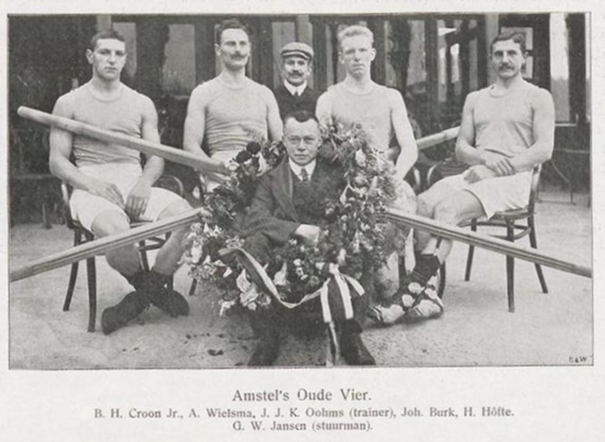In the second semi-final, Leander Club boated a crew made up of a stern pair of Fenning and Thompson – soon to be Olympic Champions in the pair – and Philip Filleul (Bow) and Harold Baker (2). Their opposition was the only Dutch entry at the regatta. The Dutch crew had steering problems from the off, and at halfway went into the booms. Leander waited for them to get clear and then rowed away to win decisively by several lengths. The Dutch crew’s erratic steering was probably down to the fact that they were more used to having a cox on board as this photo of them taken in 1907 shows: