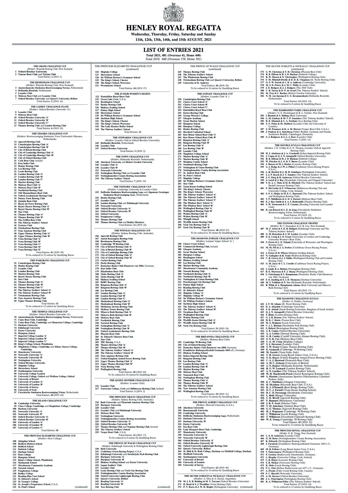 Entries are now closed with 481 crews from nine nations, including 41 from overseas, due to compete at the 2021 Regatta. The nine nations are the UK, Netherlands, USA, Germany, Ireland, Denmark, Italy, Canada and Saudi Arabia. The last Henley in 2019 saw 660 crews (501 home, 159 overseas) and 2018 had 565 crews (454 home, 111 overseas).