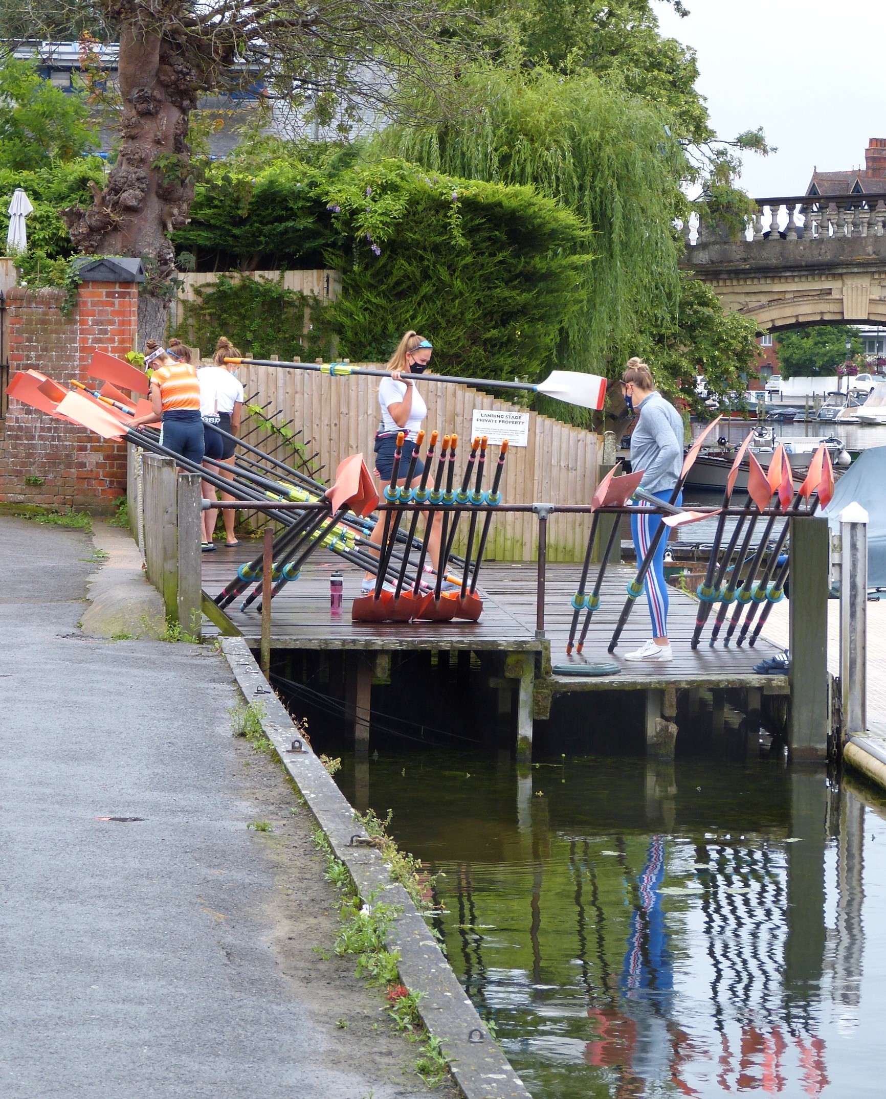 Despite the fact that I was fully prepared for a very different regatta this year, on Sunday evening I arrived in Henley-on-Thames and was slightly shocked to find that, two days before the start of racing, the river was almost deserted. The new boating area on Fawley Meadows was closed to competitors, the course was not operating under “regatta rules” and many crews were doing their final preparations elsewhere. Further, I suspect labour shortages caused by the pandemic were causing many aspects of the infrastructure to be very late in completion. However, on Monday, the boating area was open, boats could row up the course between the booms and things began to look a little more normal.