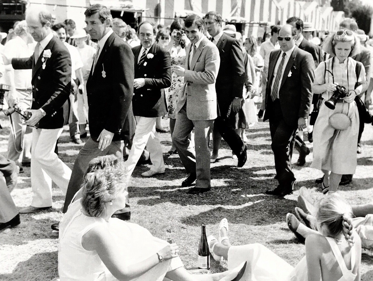 Until the late 1980s, picnicking was allowed in front of the boat tents. This picture is of a 1985 Royal visit making its way through the resulting chaos and perhaps shows HRH Prince Andrew demonstrating his interest in young people
