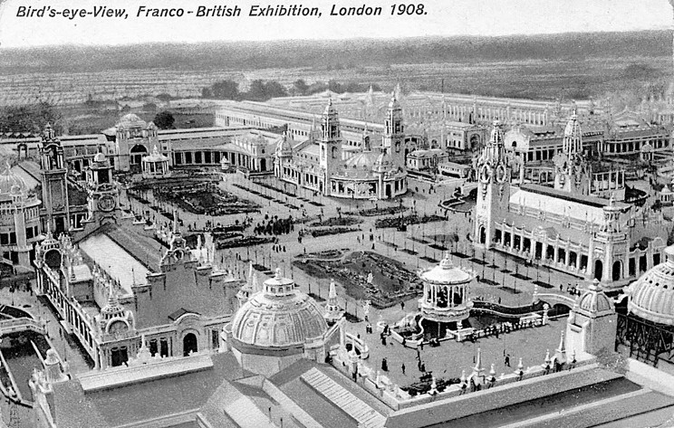 The official opening of the Franco-British Exhibition took place on 26 May 1908 with King Edward VII and the President of France, M. Armand Fallieres, officiating, and Lord Desborough and Imre Kiralfy in attendance, watching a procession of clubs, tableau and athletic displays and demonstration running and cycle races. Rebecca Jenkins emphasizes the significant point that with Pathé-News based at the Exhibition and considerable circulation rivalry between newspapers and magazines this was a moment when photographic and film coverage became significant, and to some extent part of the event.[5] Huge numbers of picture postcards were circulated, some being taken from a balloon.[6]