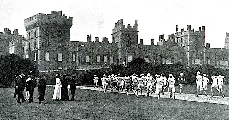 On the following day the marathon was run from Windsor Castle to the stadium, with a newly established distance of 26 miles and 385 yards (42.195 km), and the start arranged on the East Terrace so the Princess of Wales and her children could participate.