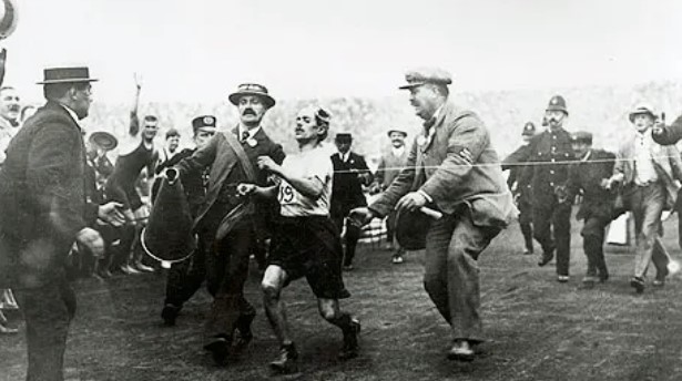 75 athletes had entered and 55 runners set off on the day, representing 16 nations, with a hot day resulting in only 27 making it to the finish. The first runner into the stadium was the Italian Dorando Pietri. Over the next dramatic minutes it became clear he was suffering from serious exhaustion. He turned the wrong way inside the stadium, was re-directed around the track, but stumbled and fell, only to be picked up by officials, who understandably hoped he could finish the race. He collapsed across the finish line. Although Pietri was declared the winner, American protests ensued and, after debate amongst the umpires, the decision was reversed and Pietri disqualified for having assistance. The American runner Johnny Hayes was confirmed as the winner, achieving a new Olympic Record of 2 hours, 55 minutes, 18.4 seconds.