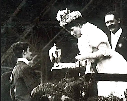 Overnight, however, Dorando Pietri became an international sensation. Desborough sent flowers and a note, ‘with every wish for your speedy and completer recovery’, and referred to his ‘splendid achievement, which has the sincere sympathy of every man and woman in the vast crowd at the Stadium.’[24] At the Olympic prize-giving Queen Alexandra expressed the public view when she presented him with a special silver-gilt trophy. Arthur Conan Doyle, who was beside the track both as a medical officer and as a correspondent for the Daily Mail, remarked, ‘The Italian‘s great performance can never be effaced from our records of sport, be the decision of the judges what they may.’[25]