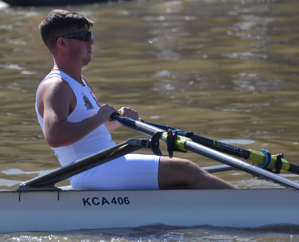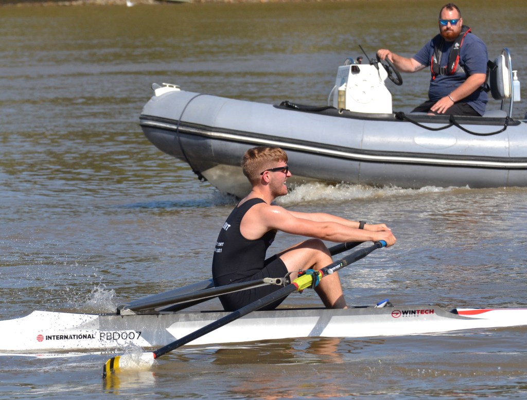 The race soon developed into one of two parts with the athletic Carter-Miller, 6ft 4in and 91kg, rating 30 and hotly pursued by the smaller man on his immediate right, George Gilbert, striking 27 strokes per minute. It was quickly apparent that Gilbert had been training hard and was much improved from last race in June. This left Lucas Britton and Coran Cherry to race each other for third place. Cherry, the bigger man of the two at 6 foot and 98kg, was leading the trailing pair but Britton, a smaller man with even less rowing experience than Cherry, was sculling gamely.