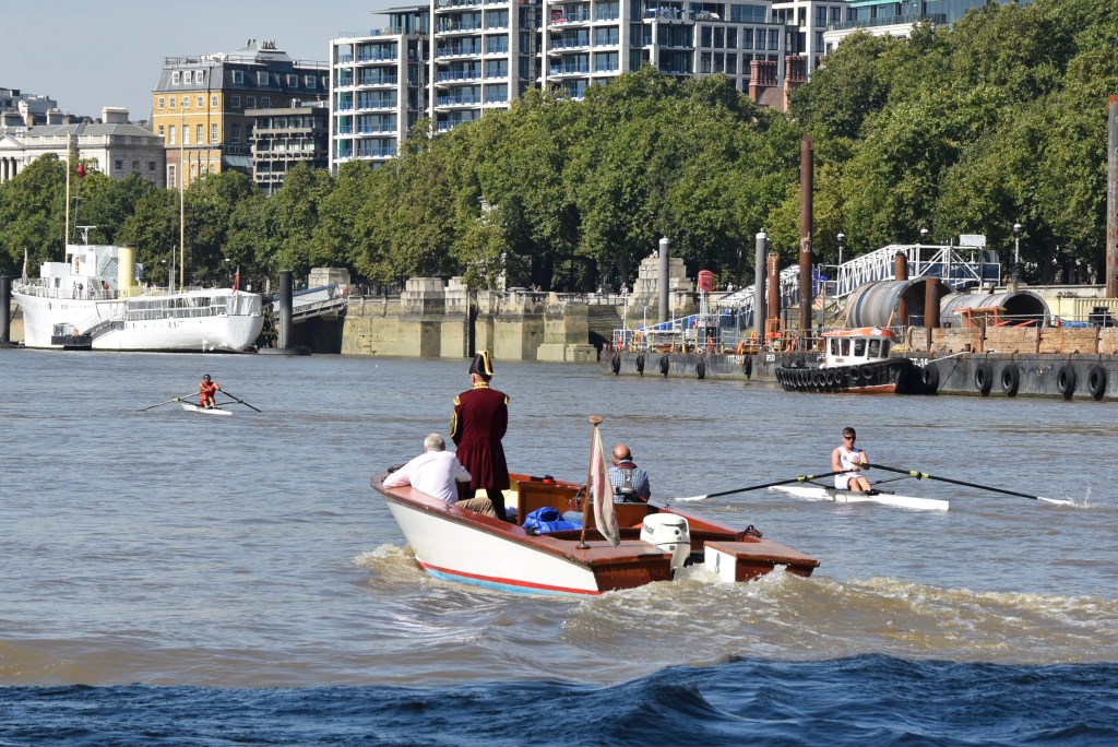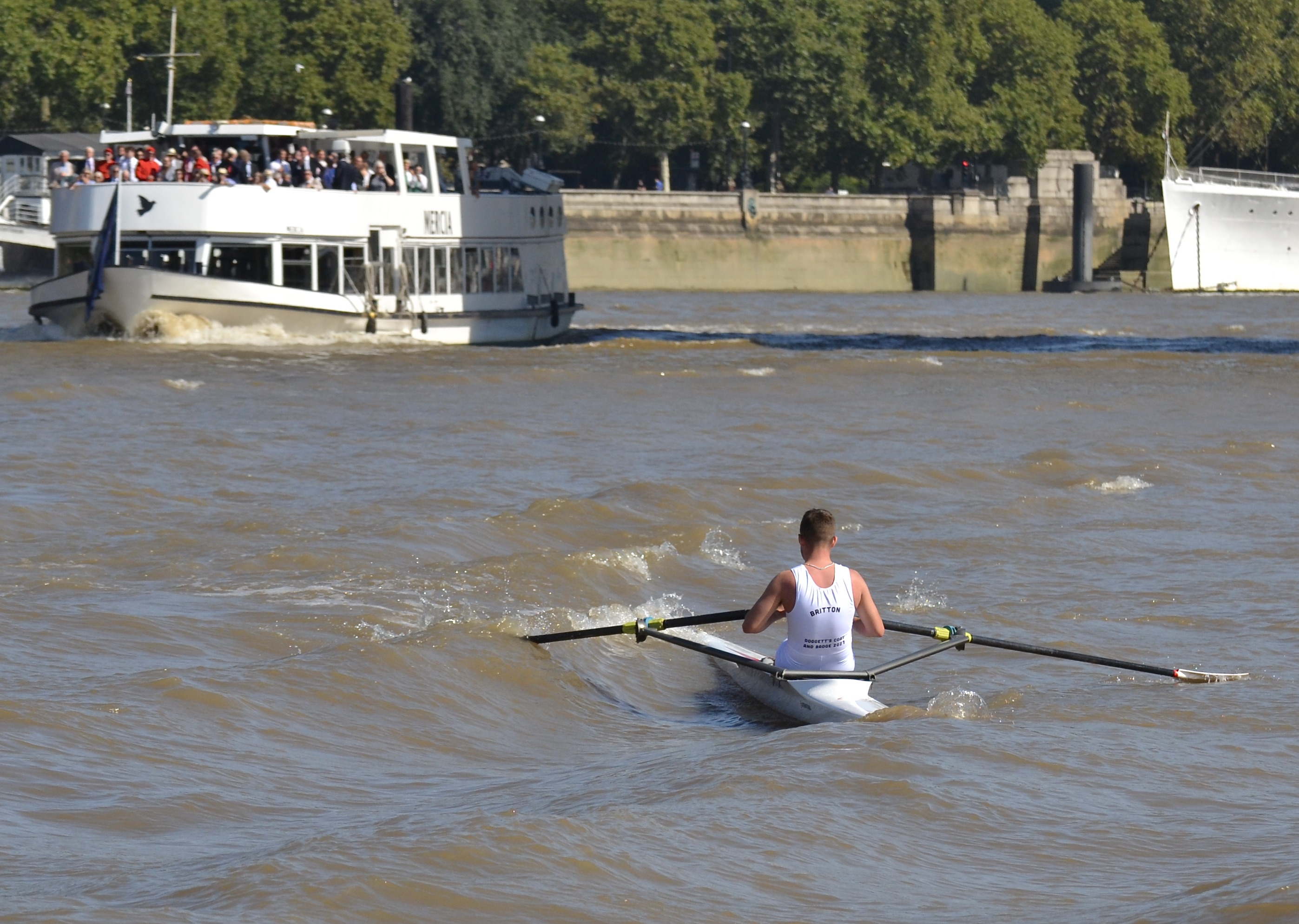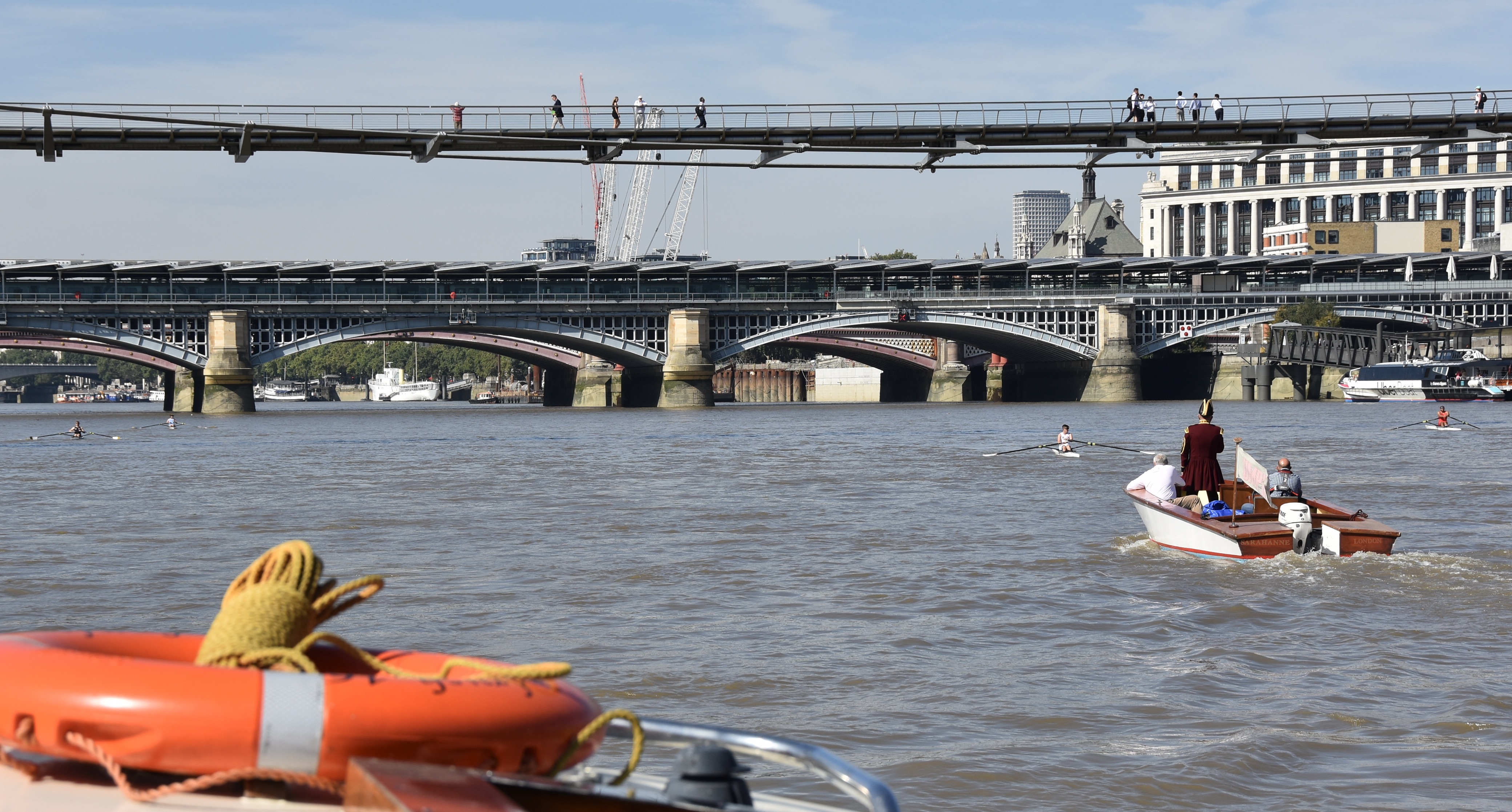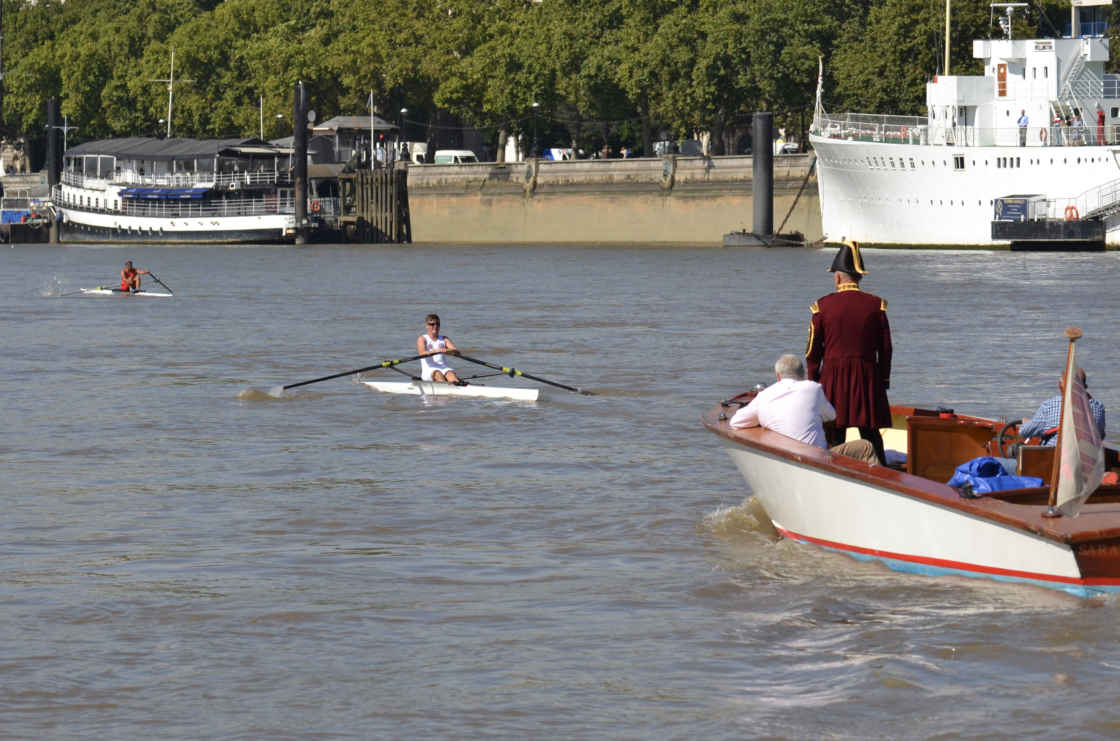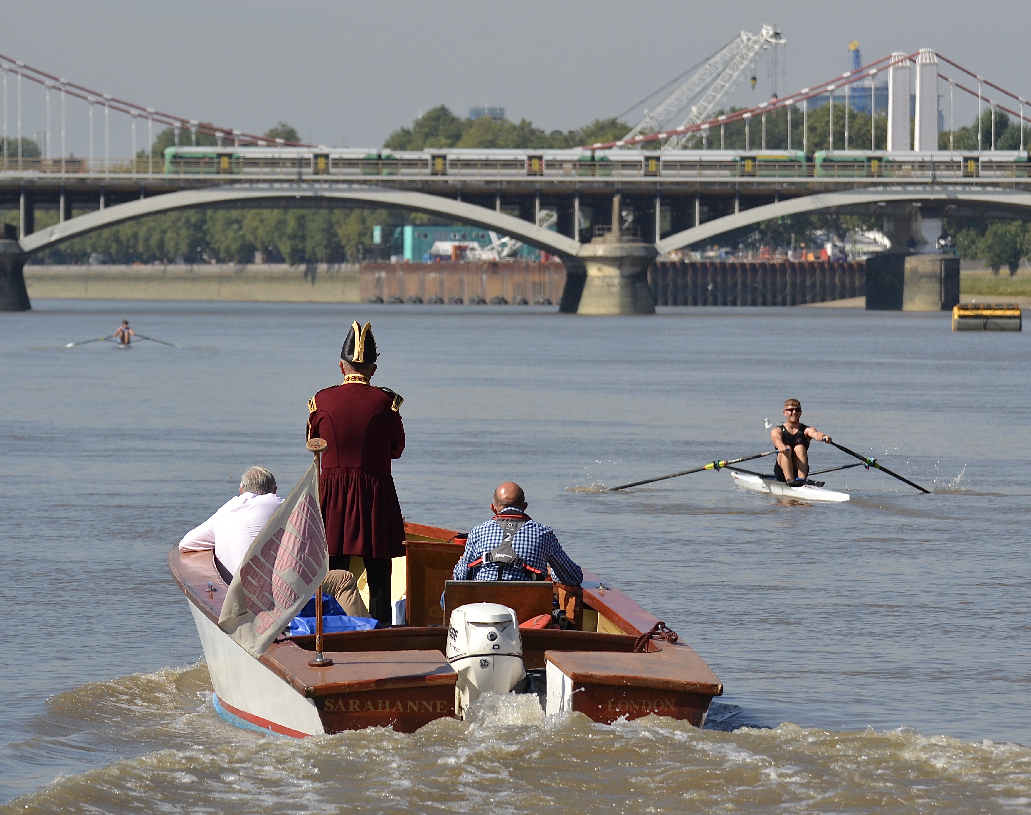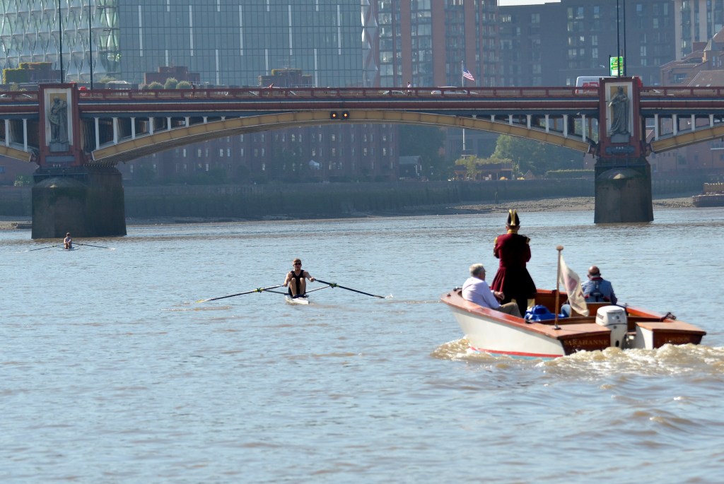 At 11.44, Umpire Bobby Prentice dropped his white flag to signal the start of the 307th Doggett’s Coat and Badge Wager and Max Carter-Miller immediately powered off to take the lead. He soon passed under Cannon Street Rail Bridge, a mere 250 metres into the 7,400 metre race, but then passed uncomfortably close to a buttress of the next bridge, Southwark, 400 metres in. No doubt he was always conscious of the fact that in his first Doggetts last June he led for the first 3,000 metres but was overtaken at Westminster by the eventual winner, James Berry.