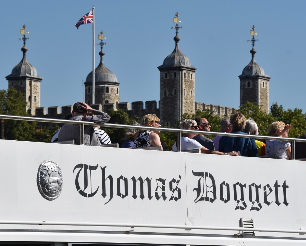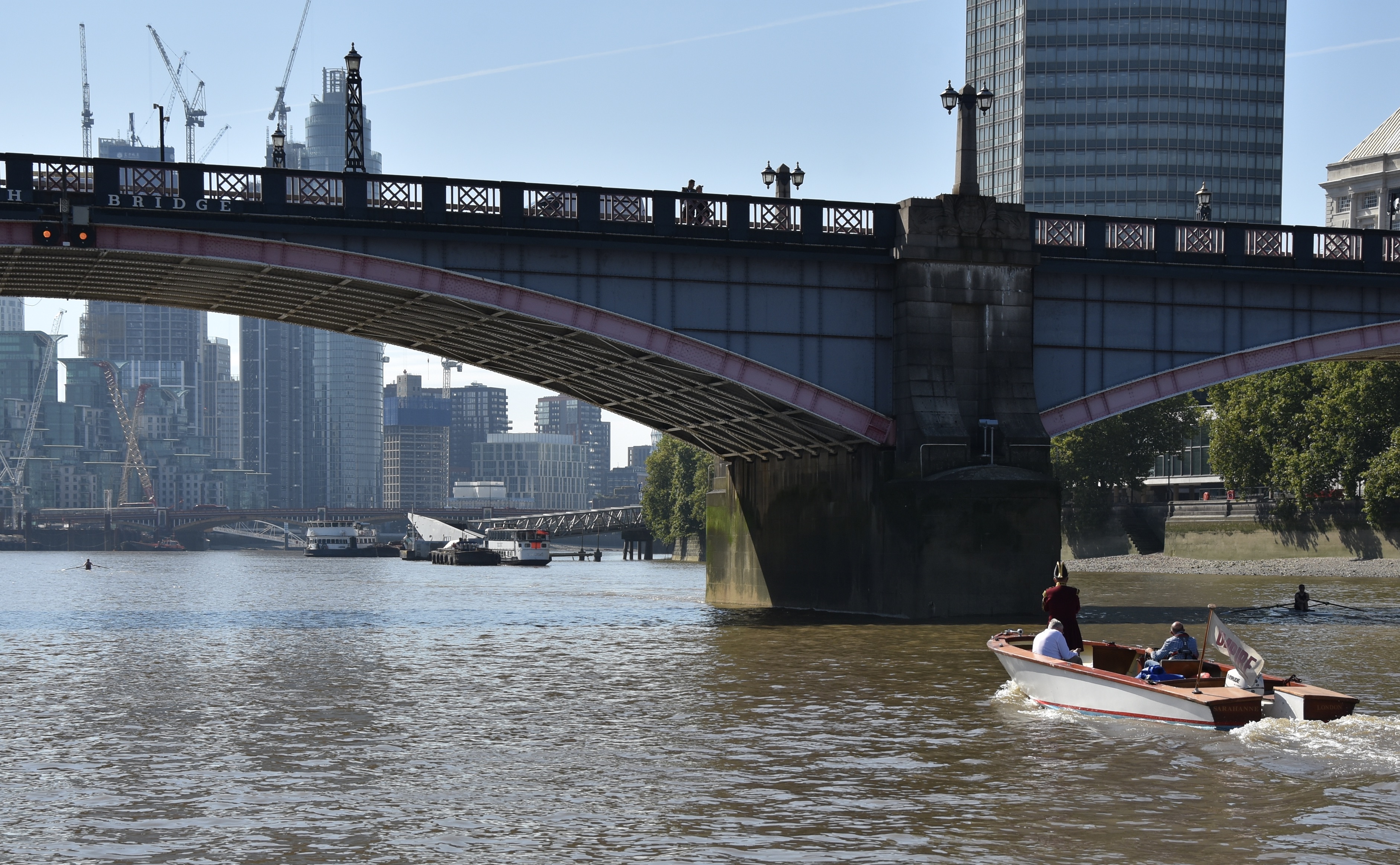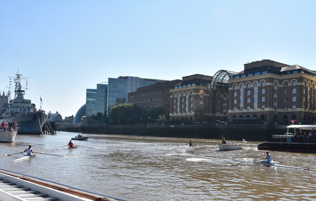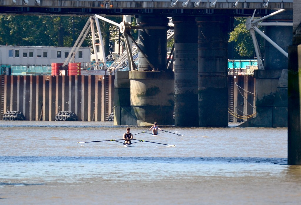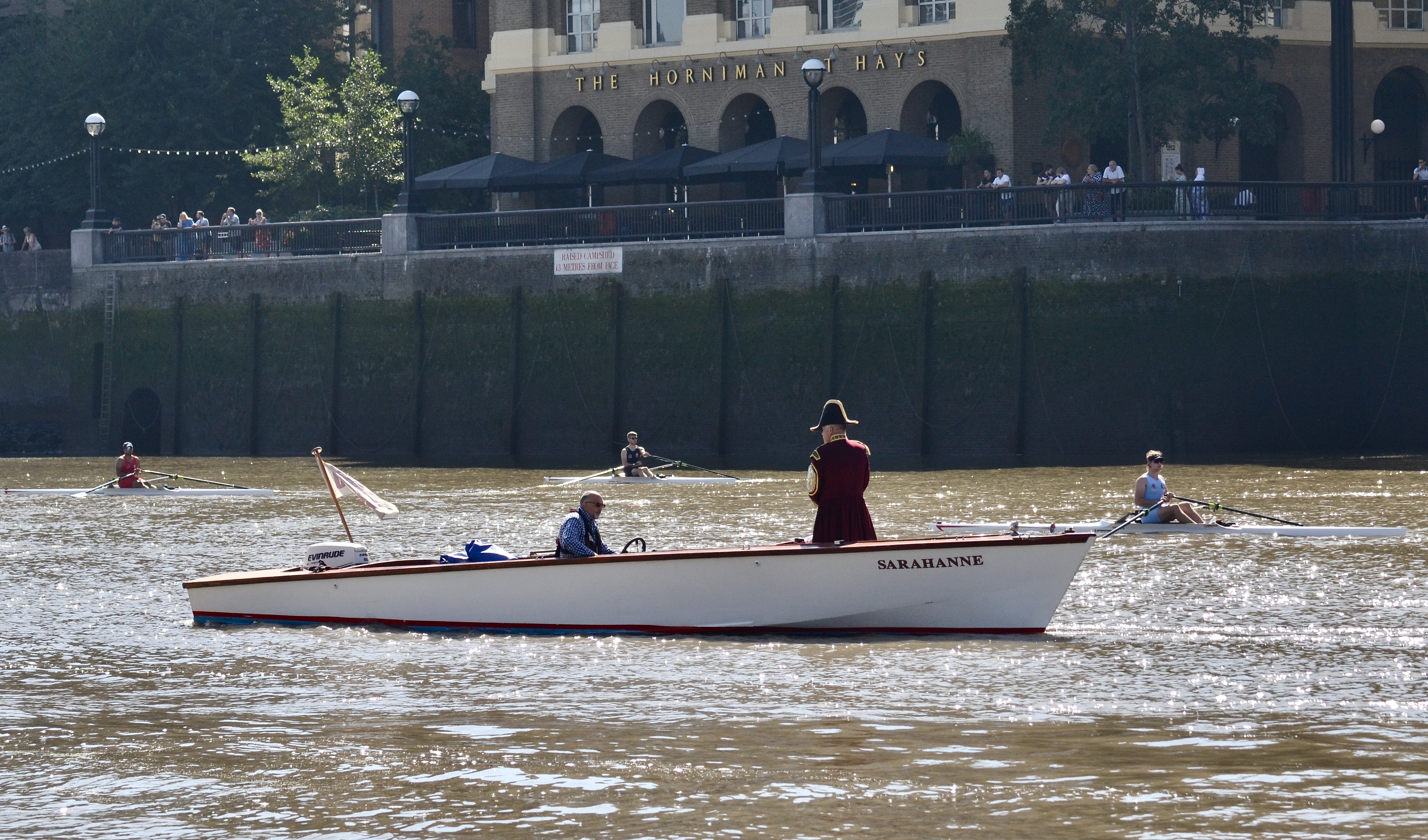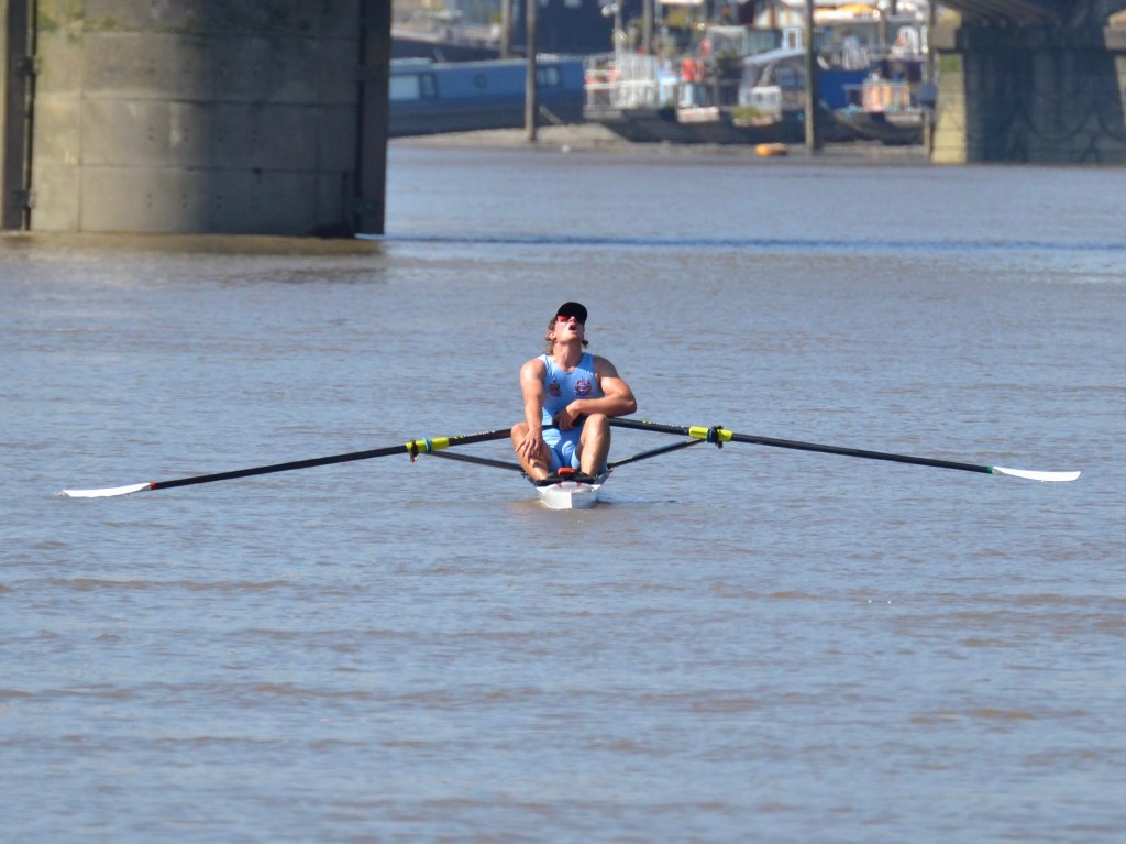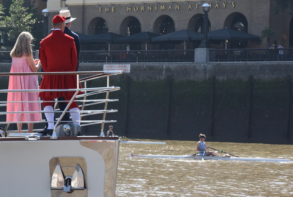 At 11.44, Umpire Bobby Prentice dropped his white flag to signal the start of the 307th Doggett’s Coat and Badge Wager and Max Carter-Miller immediately powered off to take the lead. He soon passed under Cannon Street Rail Bridge, a mere 250 metres into the 7,400 metre race, but then passed uncomfortably close to a buttress of the next bridge, Southwark, 400 metres in. No doubt he was always conscious of the fact that in his first Doggetts last June he led for the first 3,000 metres but was overtaken at Westminster by the eventual winner, James Berry.
