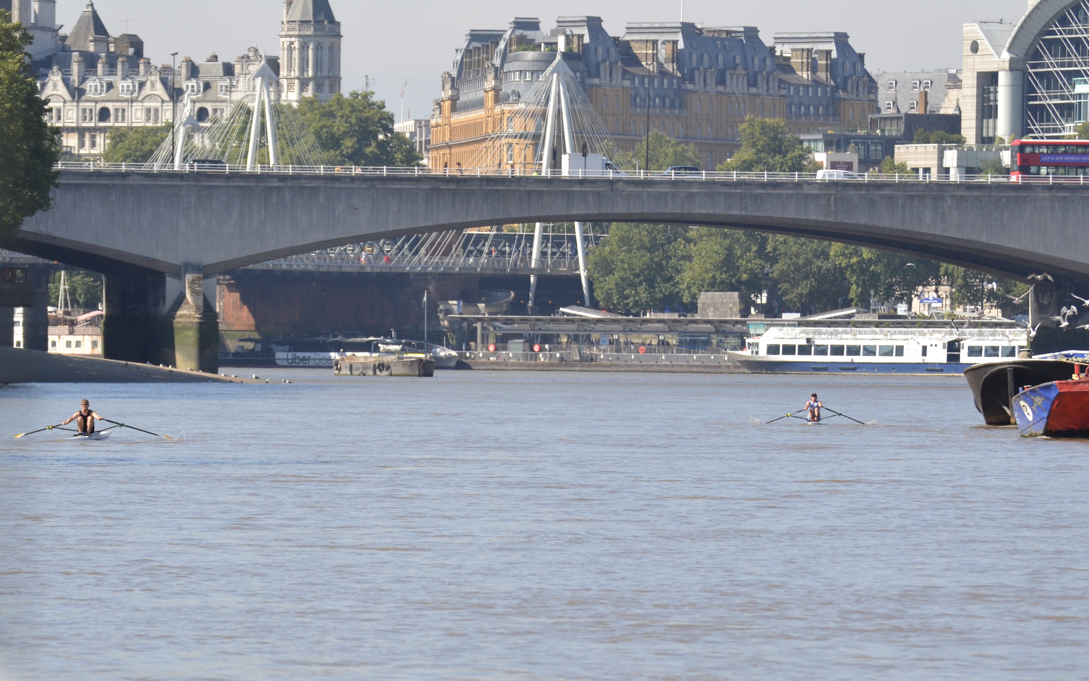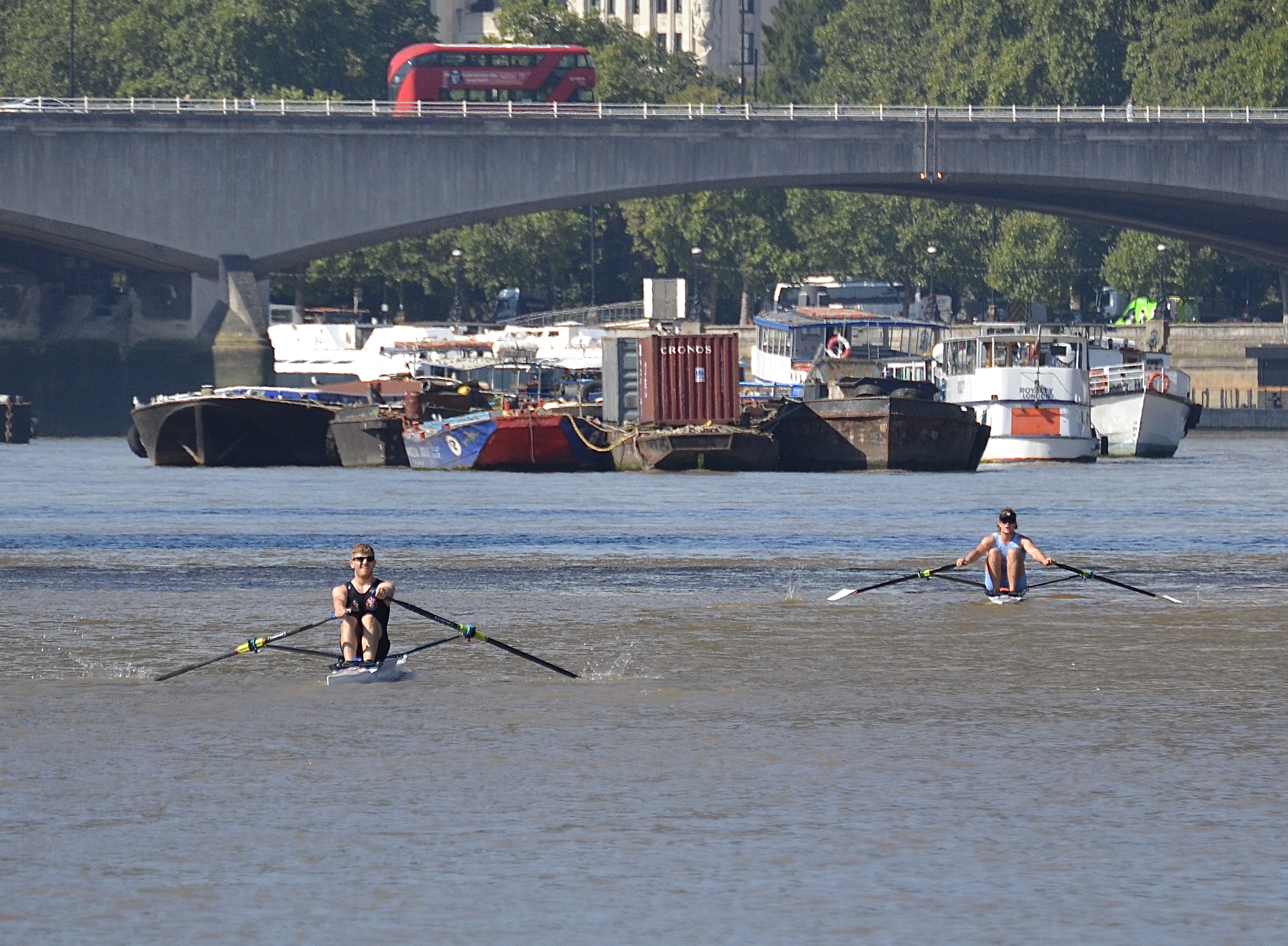 In the 850 metres between Blackfriars Road Bridge (1,150 metres) and Waterloo Bridge (2,000 metres), the competitors can choose to hug the South shore and go inside the moored barges at Coin Street, cutting the corner and taking flatter but slower water, or stay in the middle of the river and go outside of the moorings, taking a longer route but with faster though potentially rougher water. The conditions were calm so rough water was not an issue and the two leaders, Carter-Miller and Gilbert, took the inside while third and fourth placed Cherry and Britton kept to the middle.