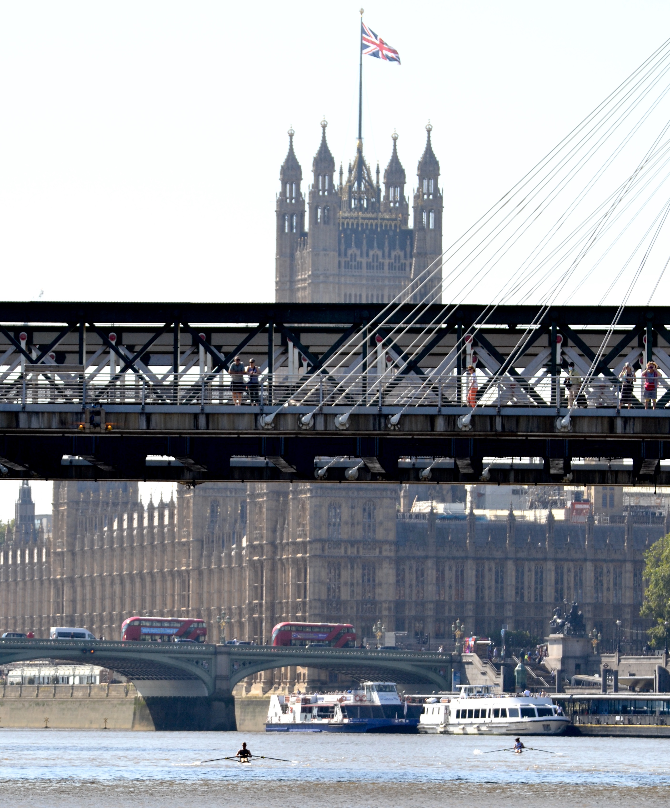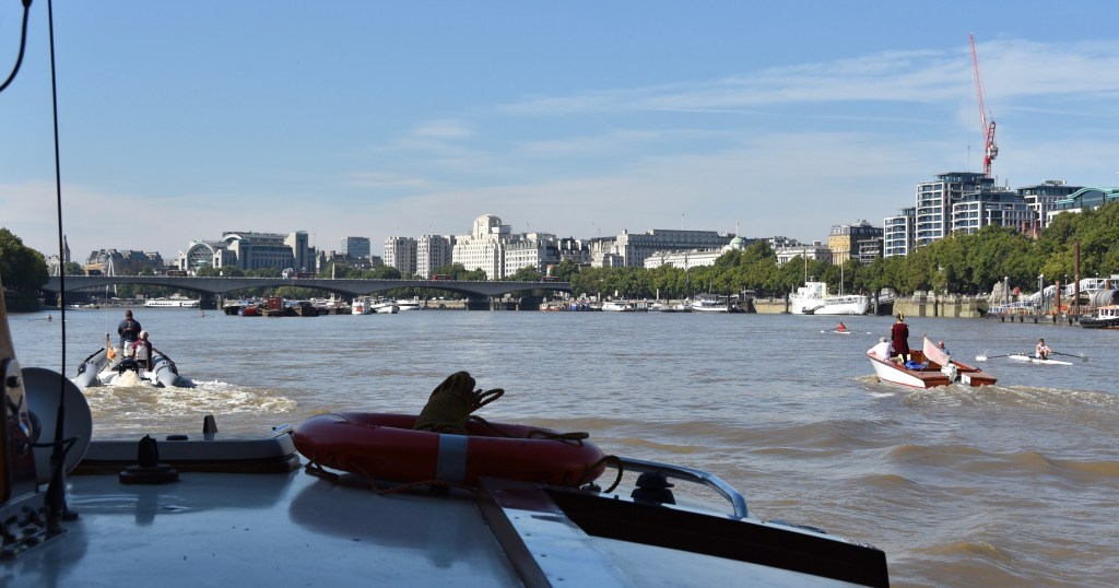 Seven minutes into the race, Britton began to fade, his few weeks of training not enough to build the endurance needed for a race of perhaps twenty-five minutes or more, and Umpire Prentice soon took the difficult decision to go past him to keep contact with the rest of the race. Of course, as soon as the umpire passes a competitor, the following flotilla of spectator boats can do so as well, with the result that the unfortunate straggler is washed down horribly. Not long after, as the leading two passed under the Golden Jubilee Bridges (2,350 metres), Prentice “dropped” Cherry as well and set off in pursuit of Carter-Miller and Gilbert as they approached Westminster Bridge and the Houses of Parliament (2,950 metres). Here, Gilbert took the better line, but Carter-Miller maintained his lead.