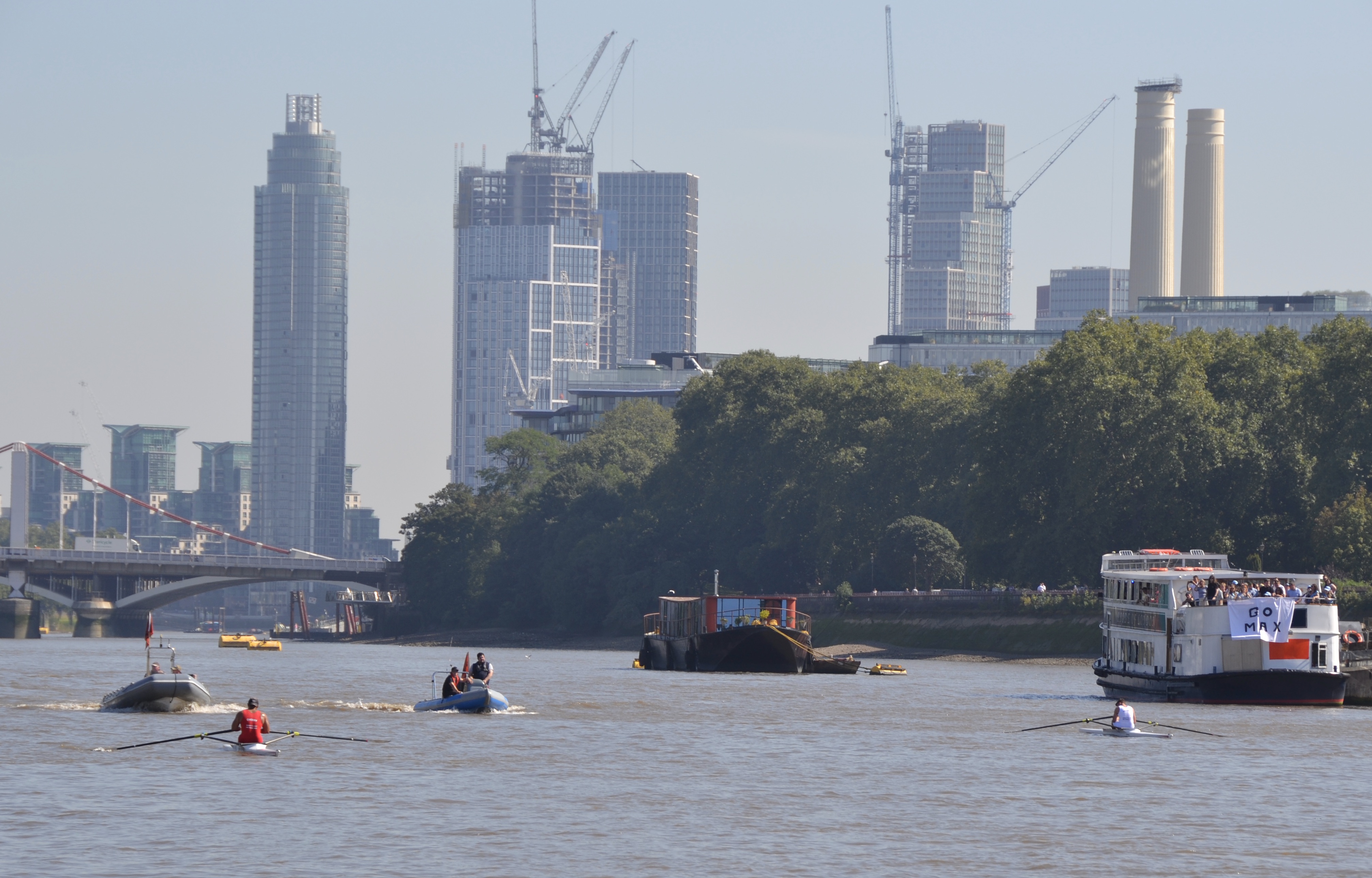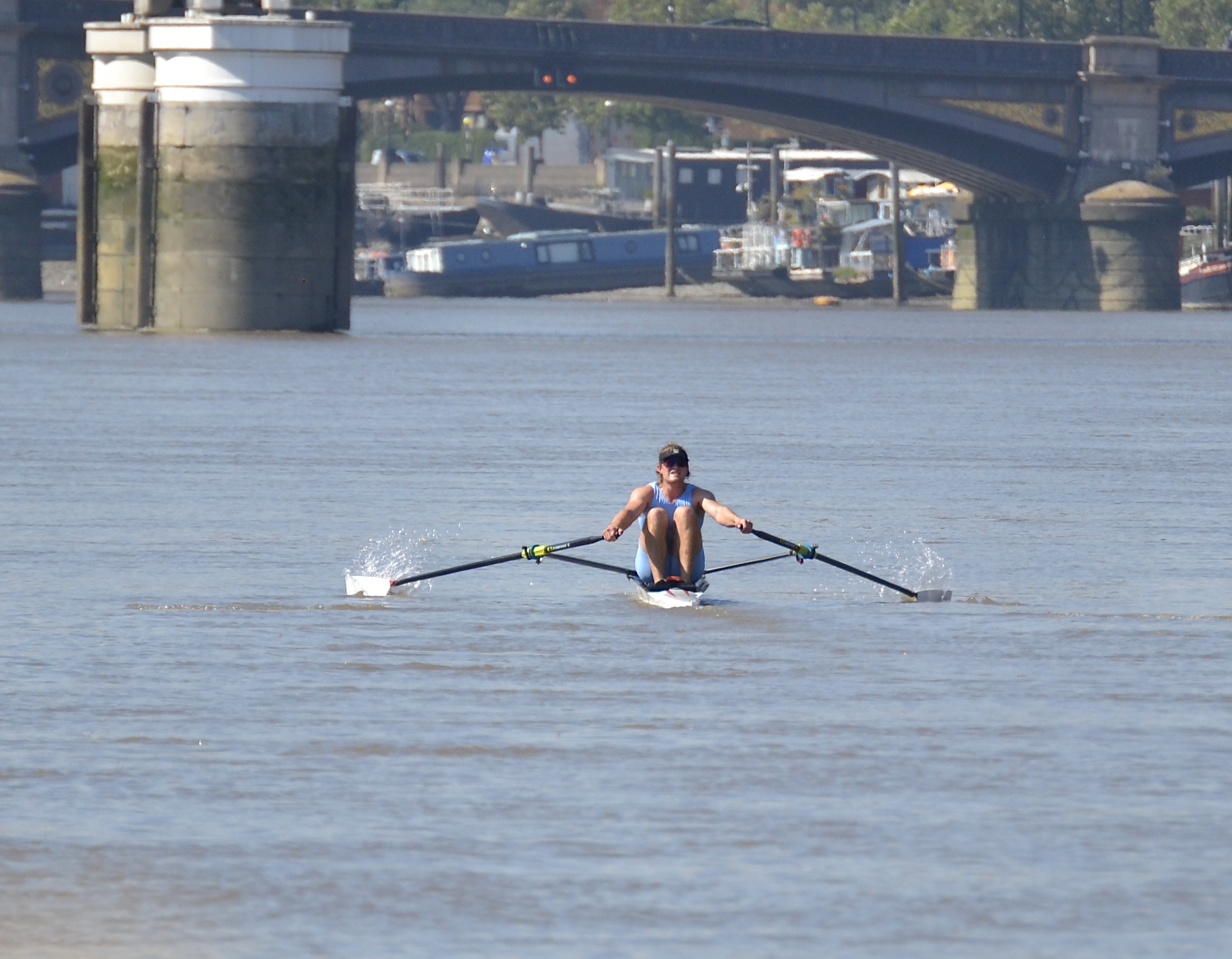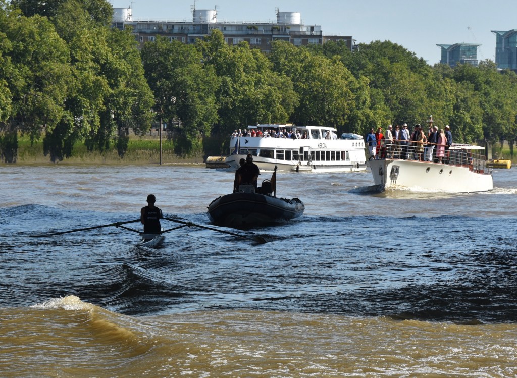 Carter-Miller reached the approximate half-way point, Lambeth Bridge (3,650 metres), in about 11 minutes 45 seconds and so could, in theory, beat Umpire Prentice’s record of 23 minutes 22 seconds set in 1973 (though Prentice had the assistance of a strong supporting wind and tide). Race commentator Robert Treharne Jones clocked Carter-Miller rating 28 strokes per minute and Gilbert, far behind but not giving up, at striking 26. Carter-Miller reached Vauxhall Bridge (4,500 metres) in approximately 14 minutes 25 seconds and maintained his unassailable lead past the former Battersea Power Station (5,900 metres).