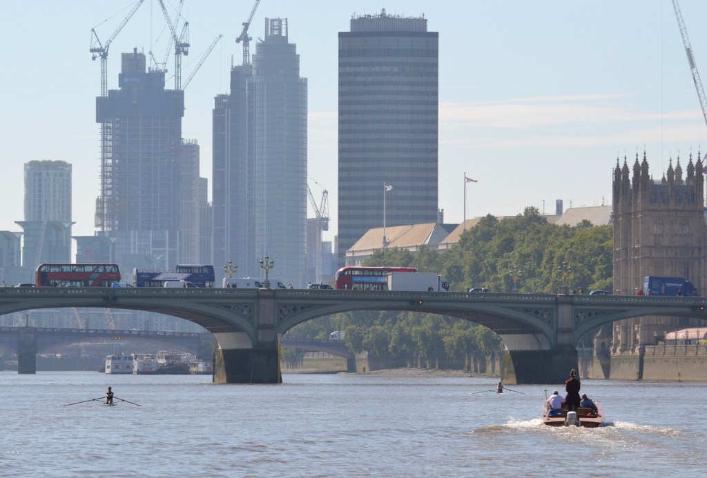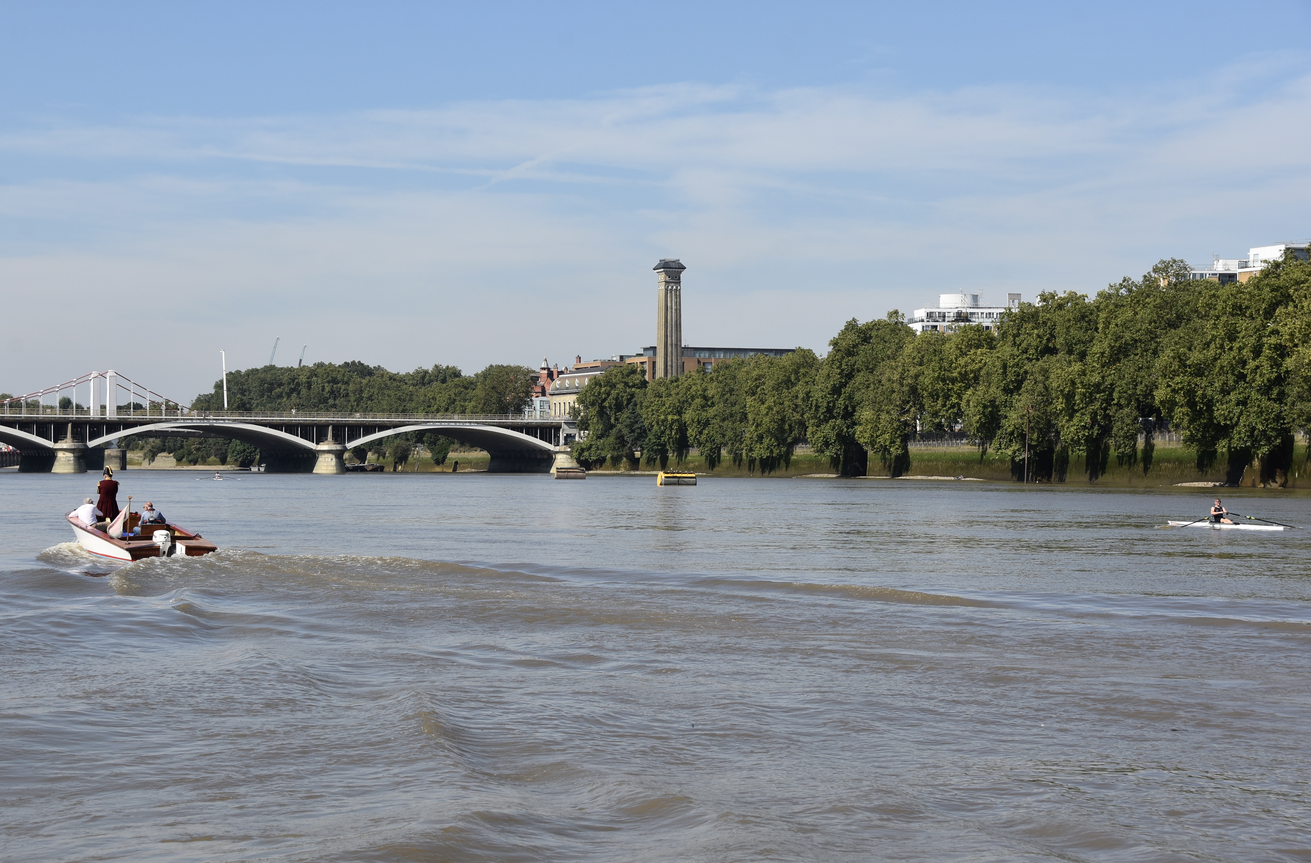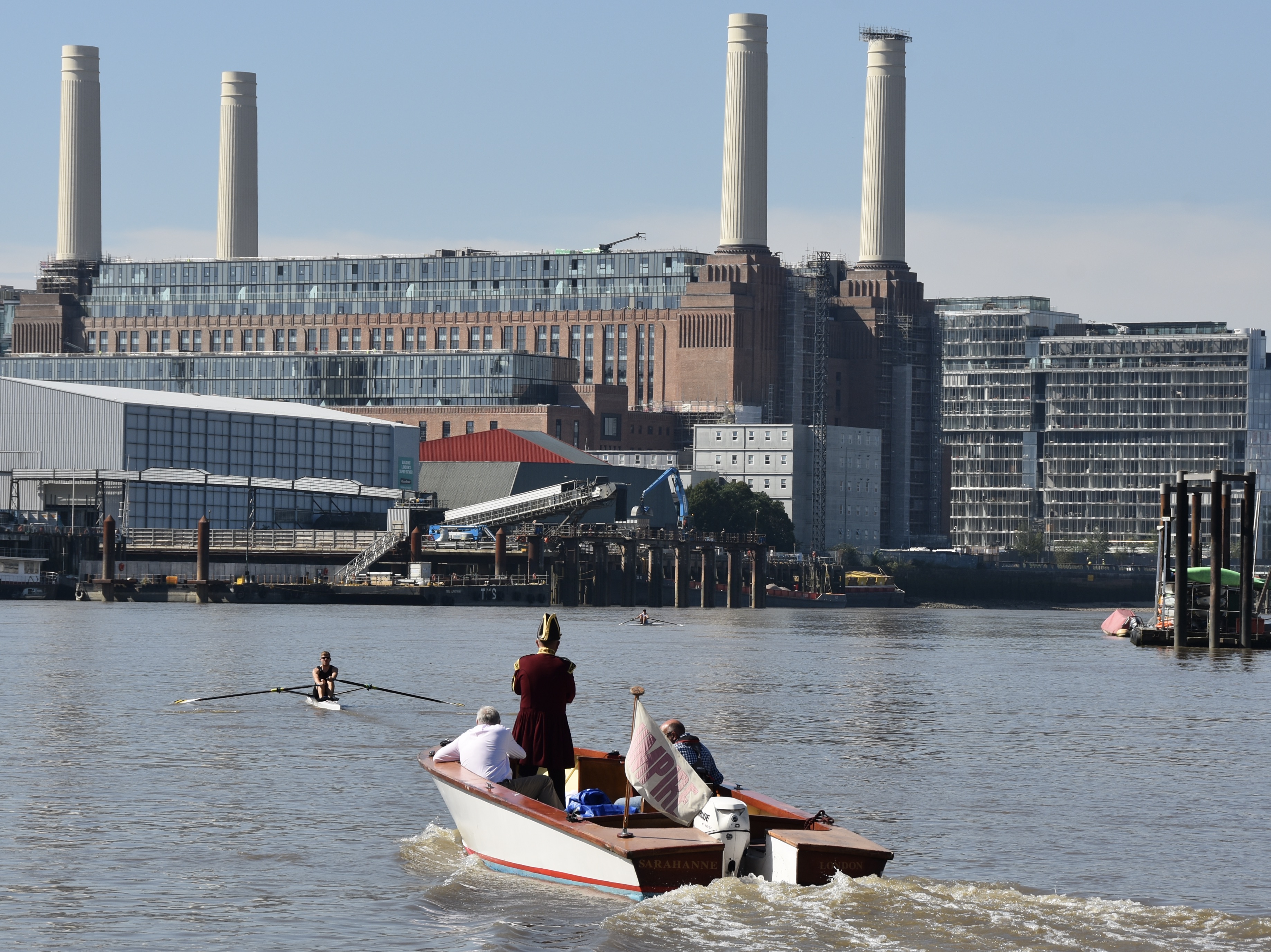 Carter-Miller reached the approximate half-way point, Lambeth Bridge (3,650 metres), in about 11 minutes 45 seconds and so could, in theory, beat Umpire Prentice’s record of 23 minutes 22 seconds set in 1973 (though Prentice had the assistance of a strong supporting wind and tide). Race commentator Robert Treharne Jones clocked Carter-Miller rating 28 strokes per minute and Gilbert, far behind but not giving up, at striking 26. Carter-Miller reached Vauxhall Bridge (4,500 metres) in approximately 14 minutes 25 seconds and maintained his unassailable lead past the former Battersea Power Station (5,900 metres).