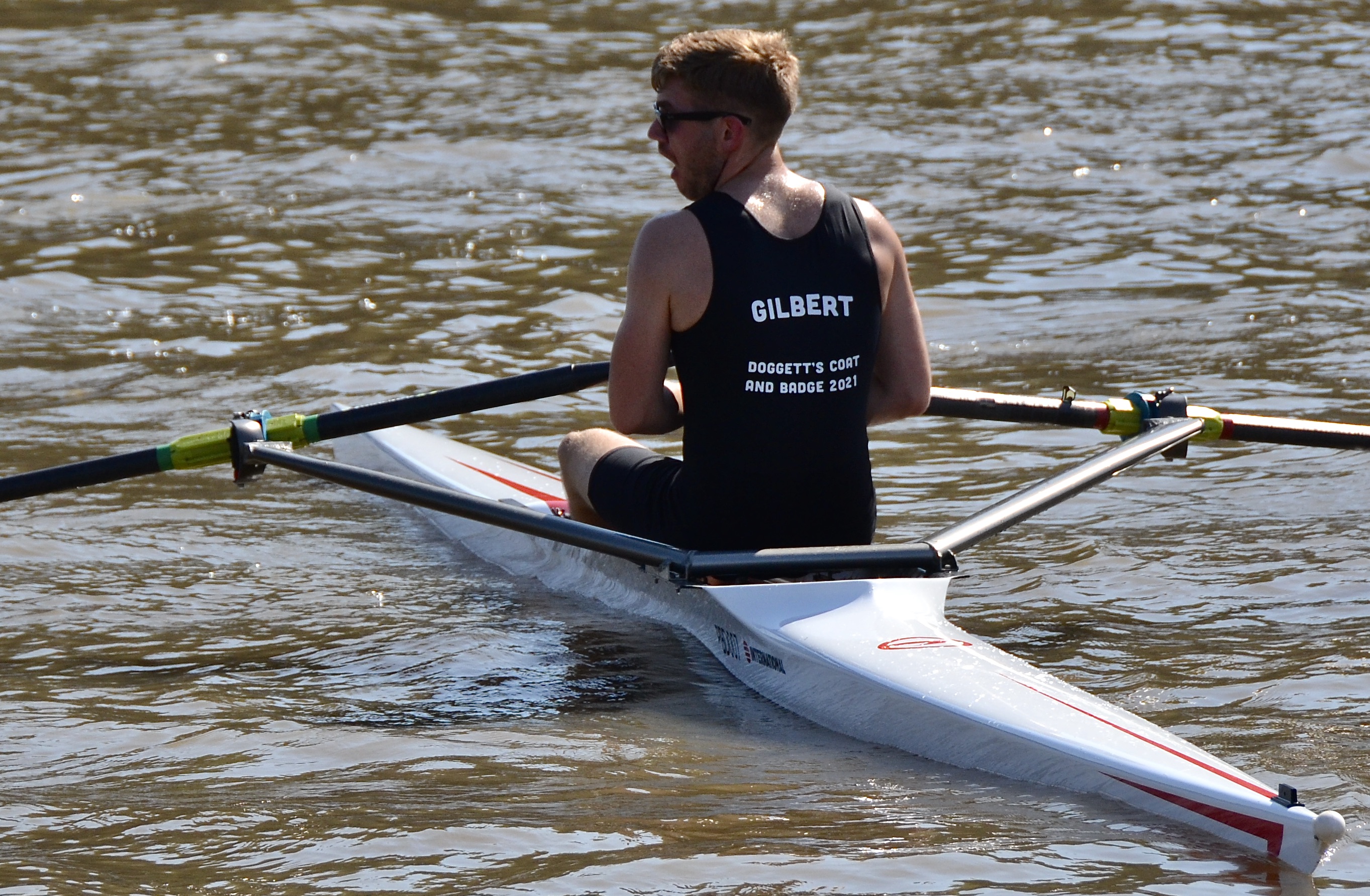 In his first race in 2019, George Gilbert “froze” on the start and was immediately passed by the umpire, understandably fazed by the conditions which were described as “brutal”. In the next Doggett’s (June 2021), Gilbert finished the course and came third out of four, defeated by two very strong opponents. In this, his third attempt, he was much better prepared, and put up a very creditable performance. He was perhaps two-and-a-half minutes behind Carter-Miller at the finish, but this does not truly reflect his form as he was passed and washed down by the umpire and the following flotilla in the last 1000 metres. George told me about his future plans: