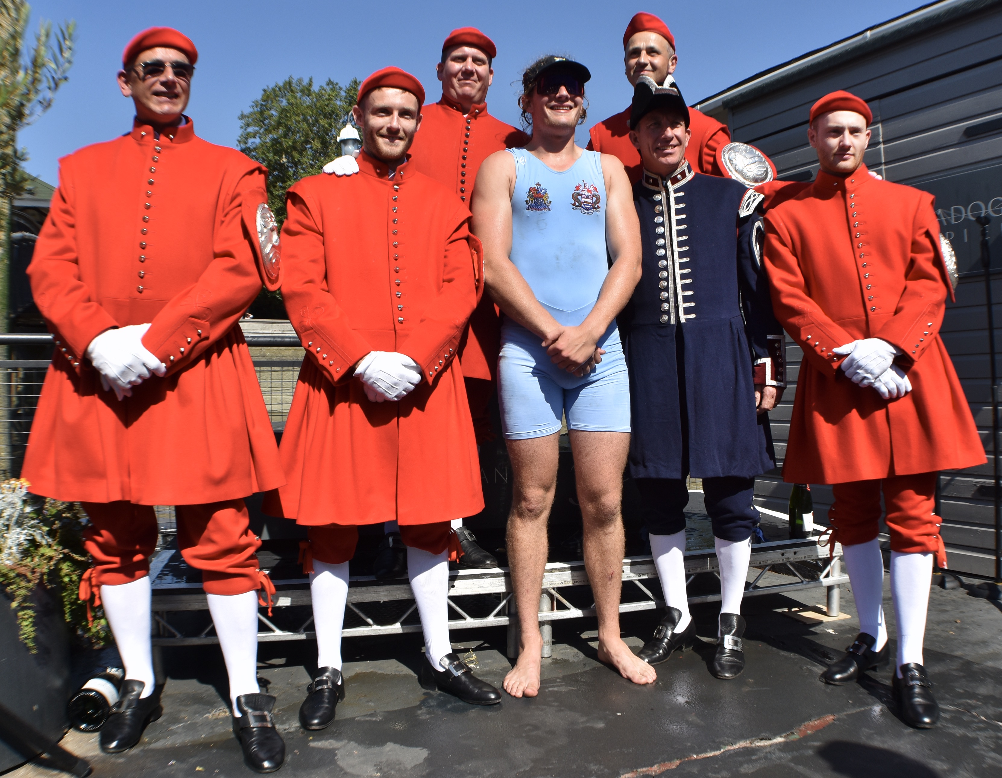 Umpire Robert Prentice won Doggett’s in 1973 and holds the course record. His timekeeper (partly obscured on his right in the above picture) was Ken Dwan, a two-time Olympian, Doggetts winner, six-time Wingfield’s Champion and Diamond Sculls finalist. The Dwan family has the most living Doggett’s winners. Ken is the father of Nicholas (2002) and Robert (2004). His brother, John, won in 1977 as did John’s son, Merlin, in 2012. Eighteen months ago, Ken had a well-publicised near-death experience with COVID.