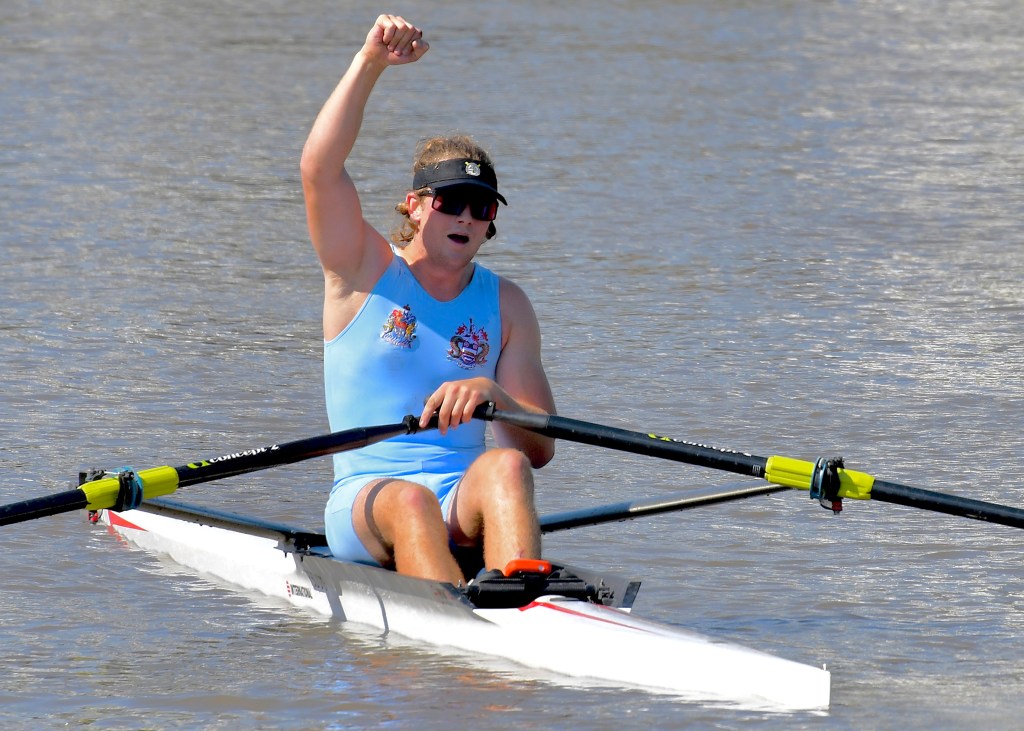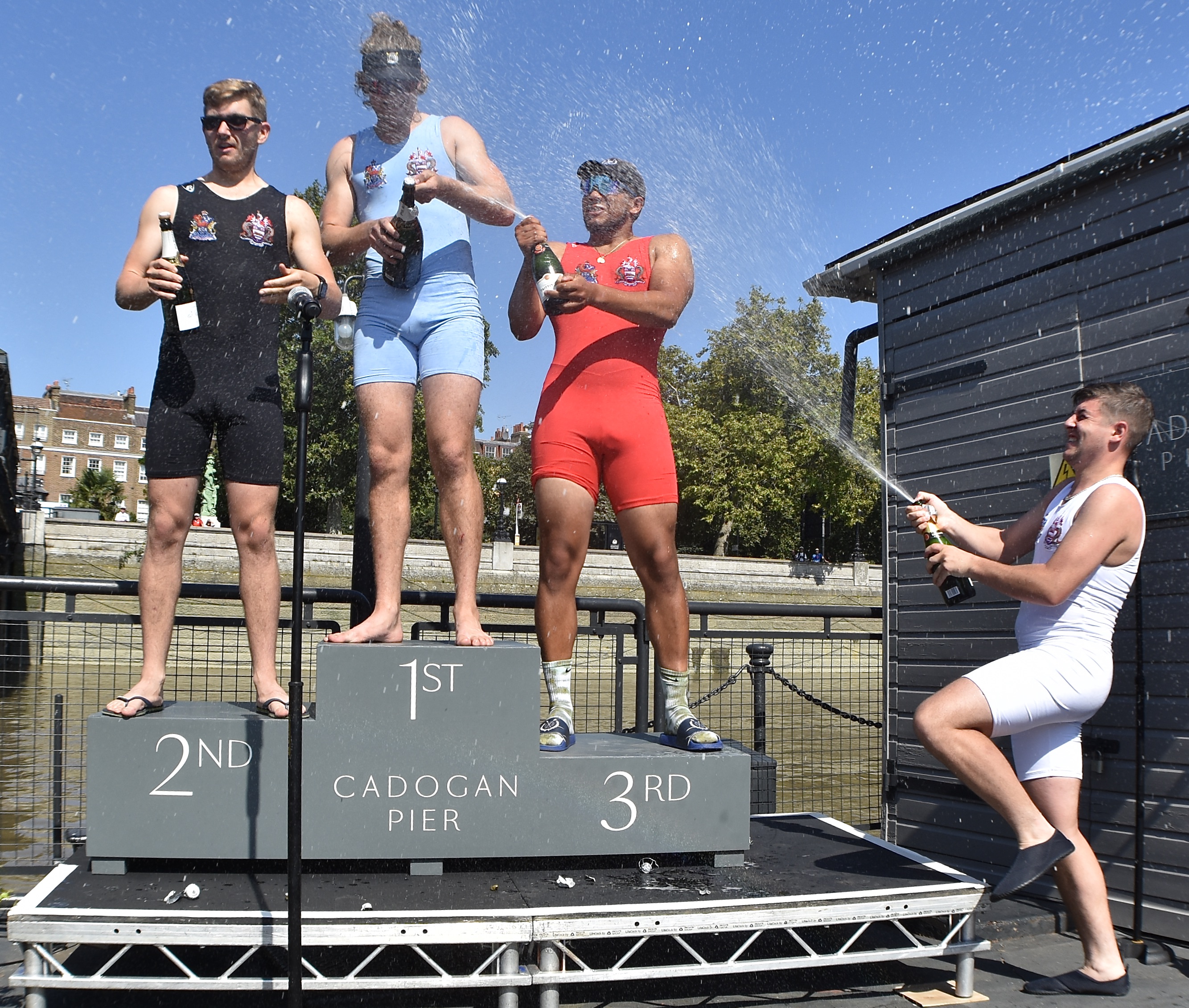 A victory salute from Max Carter-Miller who became the 307th winner of the Doggett’s Coat and Badge on 8 September 2021. Picture: Kerry Ahearn.