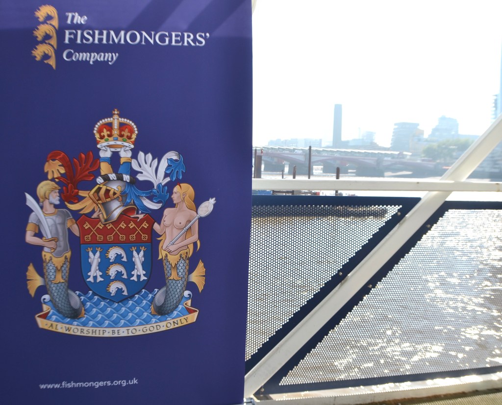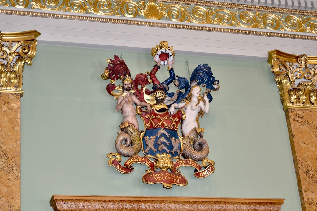 An 18th-century version of the Fishmongers’ arms. It was originally fixed to the stern of the Fishmongers’ barge and today hangs in their banqueting hall. This picture was taken in 2015.