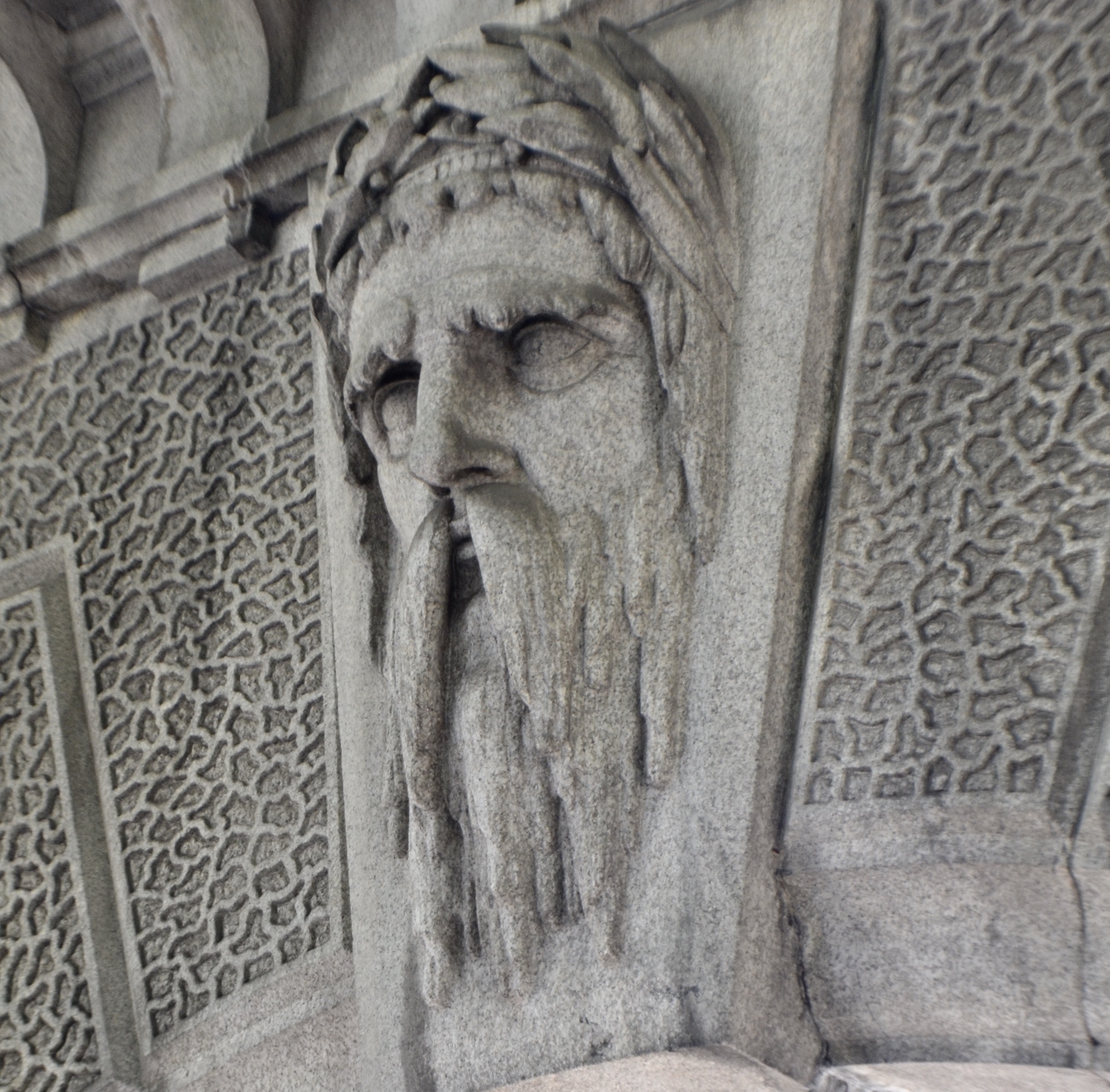 At Victoria Embankment, Old Father Thames keeps an eye on things.