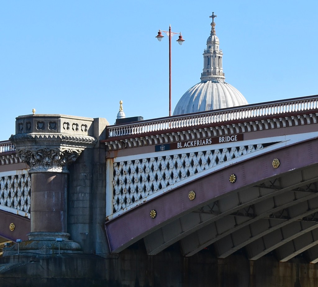 Blackfriars Bridge, completed in 1869, and the dome of St Paul’s Cathedral, completed in 1710.