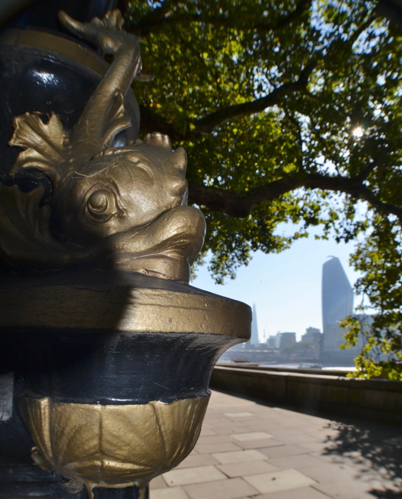 The cast-iron lamp posts along the Victoria Embankment date from 1868 and feature two dolphins (or sturgeons). They were inspired by the dolphin sculptures on the Fontana del Nettuno in Rome.