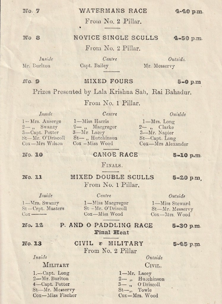 Event 7: Waterman’s Race. This is a mystery. Could it have been for local Indian men who worked with boats as their trade? This idea is perhaps supported by the fact that their names are not recorded, the casual racism of the time probably making such information of little interest. In my history of Shanghai Rowing Club, I noted that the Europeans put on a race for Chinese men in their regattas from at least 1901 onwards.