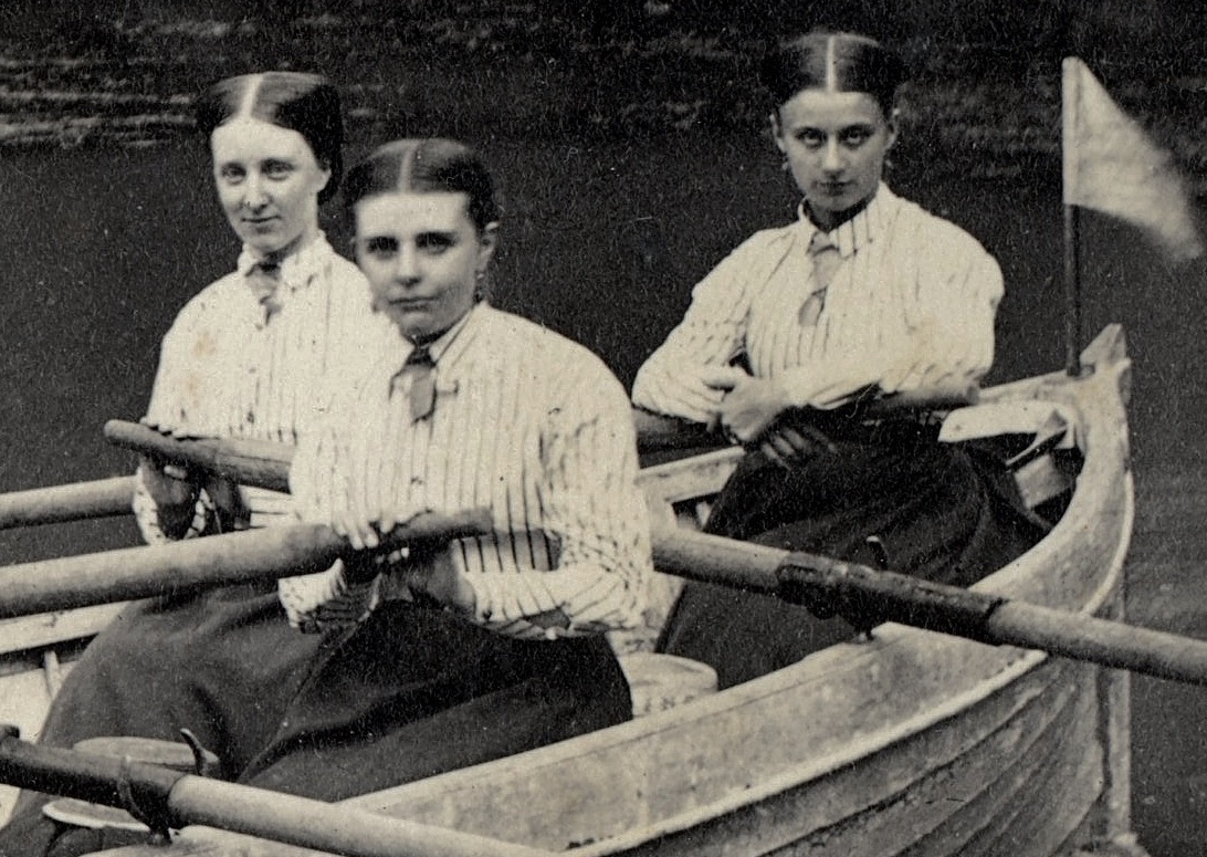I am certain that these are pictures of a group of women who took their boating seriously, they were not just friends who sat in a boat to make an interesting photograph or who would occasionally, randomly and inexpertly go rowing. They all look confident leaning on their oars and seem at ease in a boat. Notably, they are all in uniform rowing costumes. The women in the Houston held photograph have boater hats with “Undine” on the band, a reference to the mythological aquatic female creatures, and this could be the Undine Club or the Undine Crew. They are in matching skirts, blouses and, most interestingly, they seem to be wearing some sort of short boating jackets, perhaps with brass buttons.