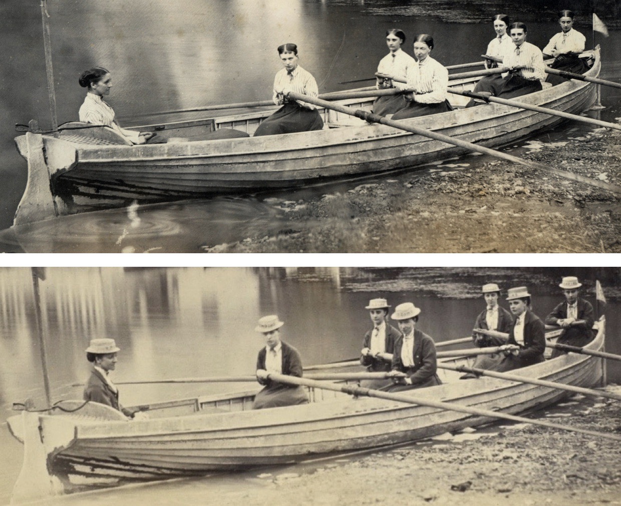The Internet compresses distance and last year it enabled me to reconnect two long-separated 153-year-old rowing photographs, one residing in Bagshot, Surrey, England and the other held in Houston, Texas, USA. I found that they were pictures of the same crew of British women in uniform dress in a boat in British ruled India, the American photo showing them in their club boaters and jackets but the British picture showing them without such encumbrances.