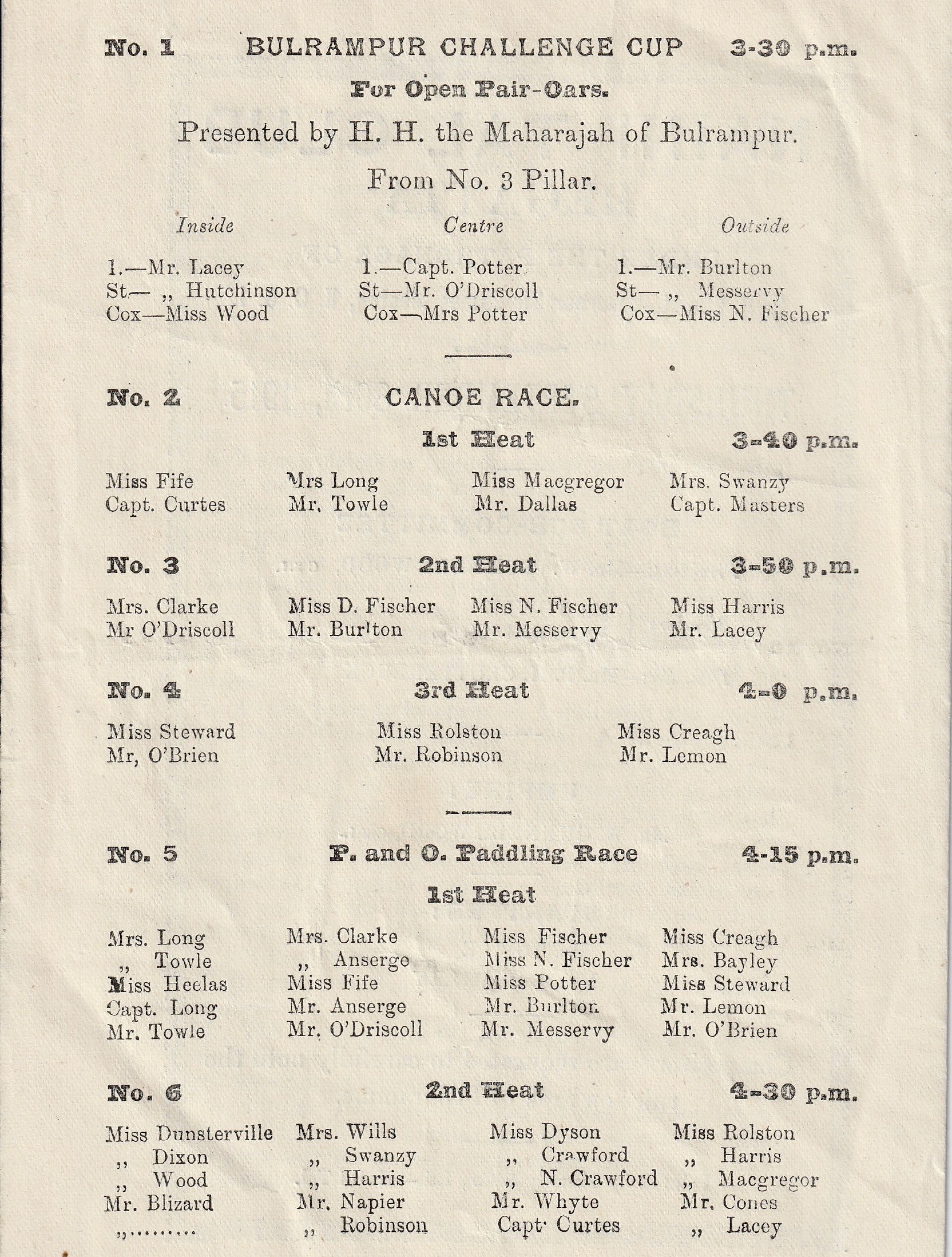 Event 3: P and O Padding Race. The “P and O” is presumably a reference to the shipping line and the three women, two men crew must mean that one of the women is coxing. What sort of coxed, four-person boat could be propelled by paddles and not oars, I do not know.