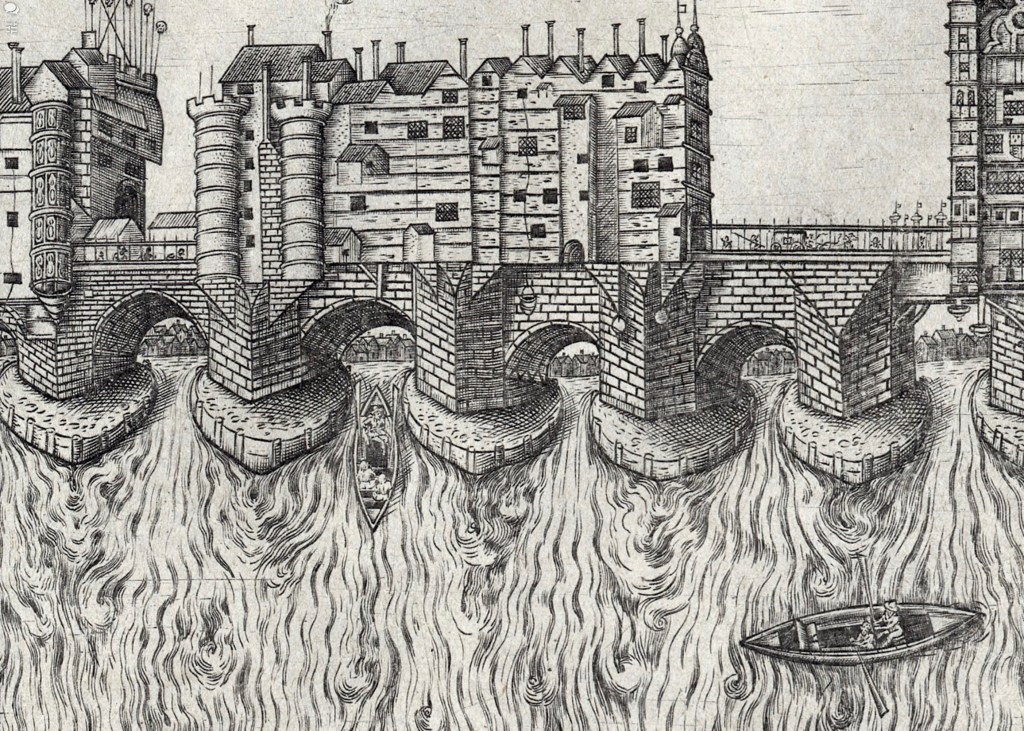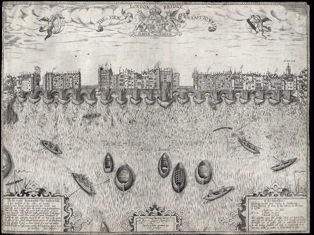 The View of London Bridge from East to Weste by John Norden, 1597. As this picture indicates – and as Sir Thomas Rempston had confirmed 1406 – passing under the London Bridge of 1209 was a risky act. Picture: Folger Shakespeare Library (CC BY-SA 4.0).