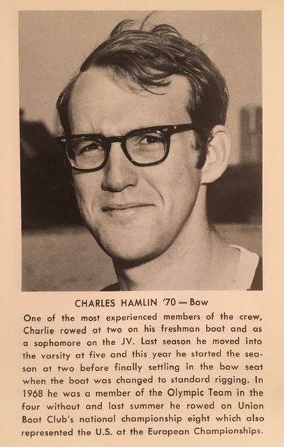 A cheerful champion who loved the sport of rowing, Charlie Hamlin displayed that passion in many ways throughout his life, but the longest-lasting of his contributions to rowing history, a subject that he cared strongly about, may lie not in his extraordinary life-time rowing accomplishments, now scattered through race programs and books to be flipped through in the years to come, but in the tapes of his race broadcasts. His words and his dialogue with Andy allow us to close our eyes, and to hear his voice again, refreshing memories once more of those classic aquatic battles waged every year on the Thames. Those recordings give us the privilege of re-experiencing not just an inspired description of the contests as they unfolded, but of again appreciating the warmth and wisdom of a truly remarkable man. His broadcasts are a priceless combination of both Charlie Hamlin and Harvard and Yale rowing history come to life again. Thank you, Charlie, for your service.