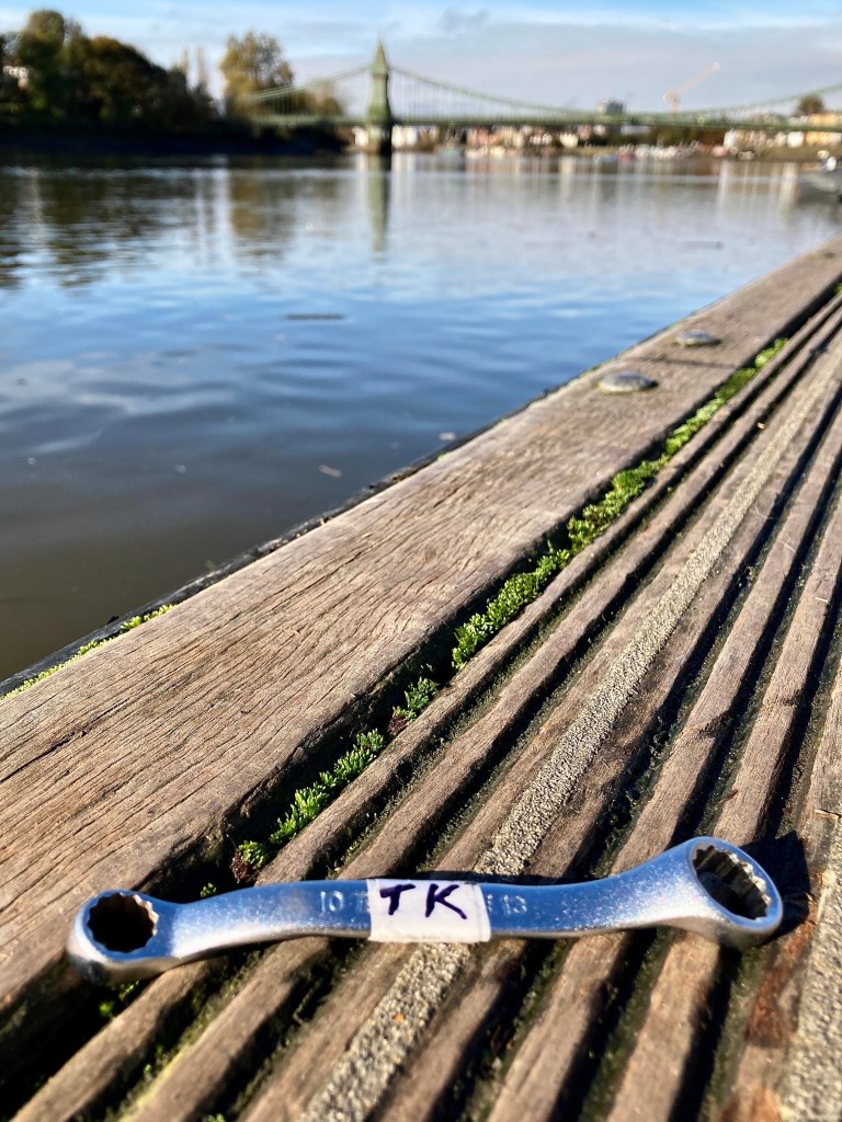 “Henri must have soon discovered that at the time, a rower needed two spanners to rig a boat” – The Rigger Jigger is the product of a series of conversations held in the late 80s at the old Sons’ clubhouse bar overlooking the Upper Mall in Hammersmith. As I recall, Henri and Nigel Watson, a Sons member, were discussing their shared frustration with the need to use a half each of two spanners, and what the perfect tool could be. Together they came up with the concept (including the offset). Another Sons member, Conor Brownlow, proposed the name. Henri, through Teng Tools, knocked up a few prototypes of differing length and offsets (but always 10 & 13mm), and eventually settled on what you can buy now. There are sadly no royalties coming the Sons way, but the creative process definitely generated a bit of business at the club bar!