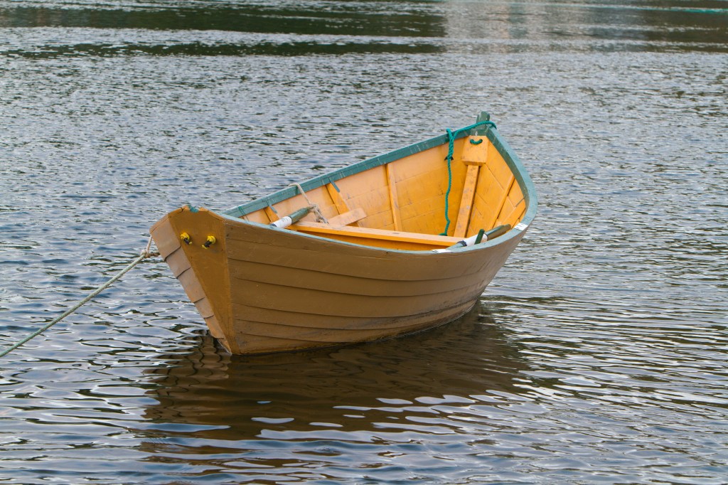The photo of the single person American style dory, anchored by the stern, intrigues me. (The painter is leading in over the bow.) The boat is of traditional construction, with clinker topsides and thole pins.