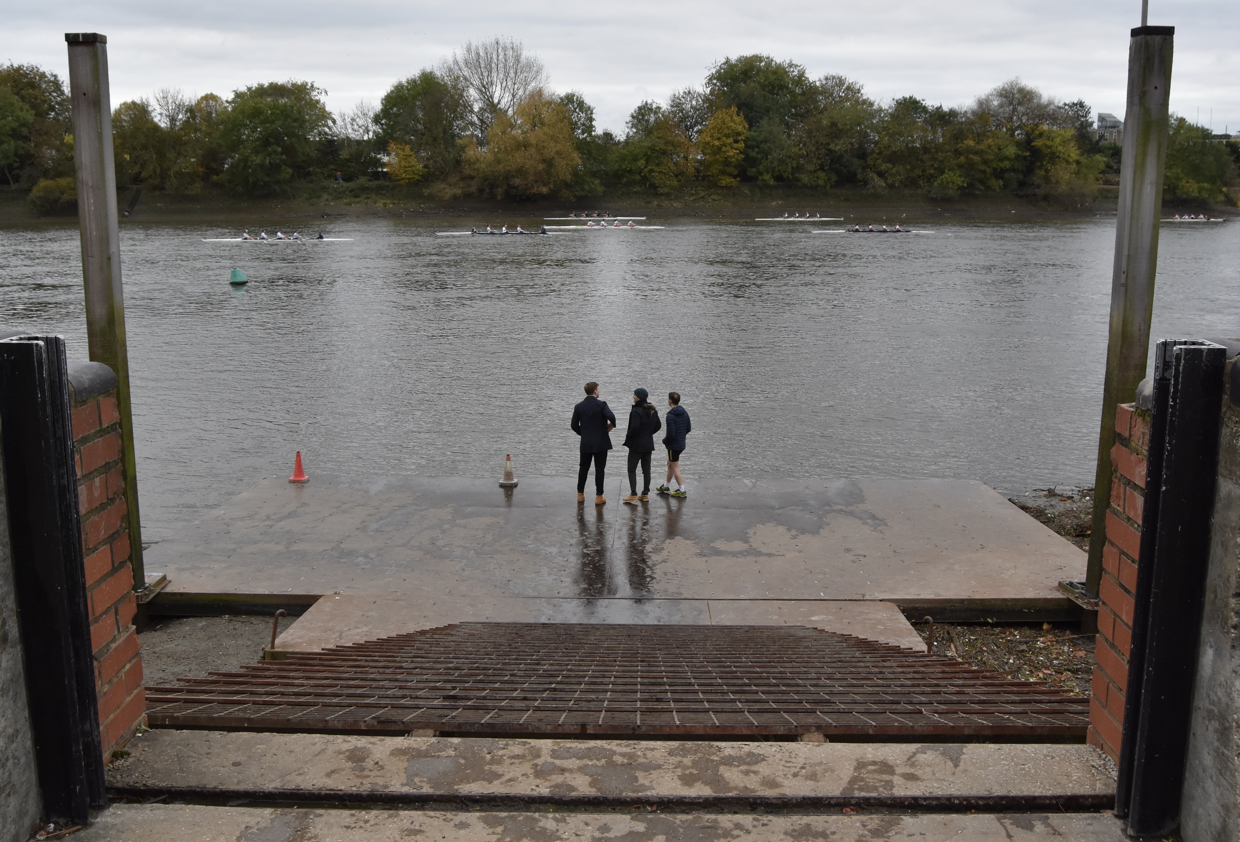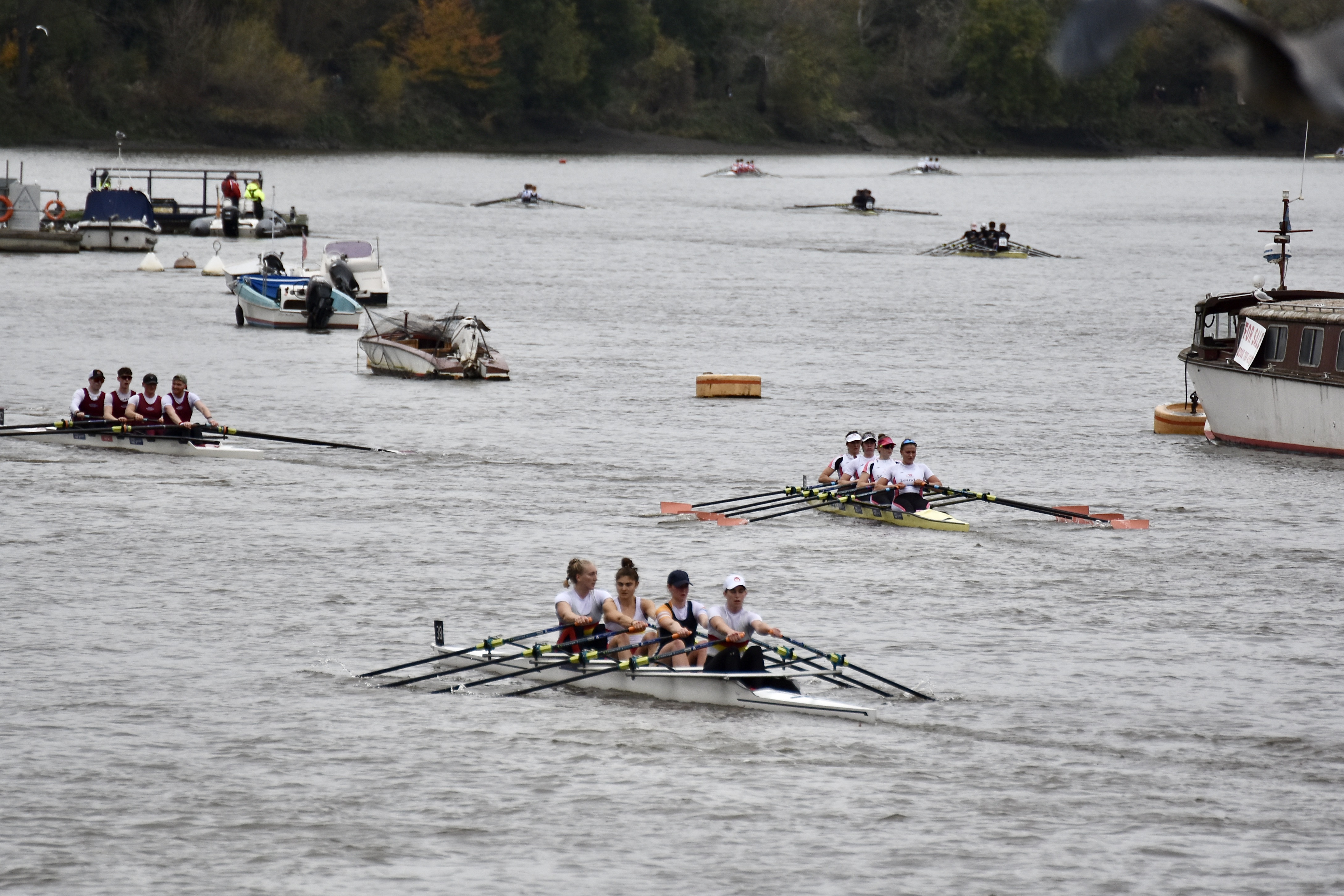 In the foreground is Sudbury A racing in Women’s Club 4x. In the background, crews pass the pier that seems variously known as “Hammersmith”, “Hope” or “Dove”.