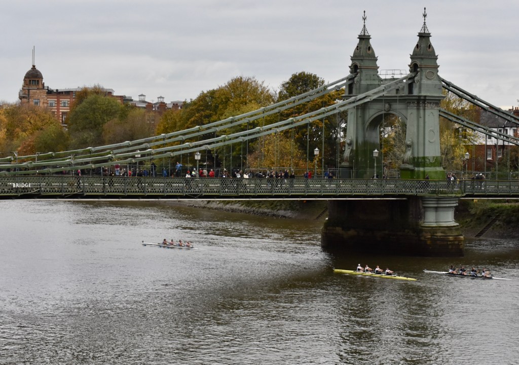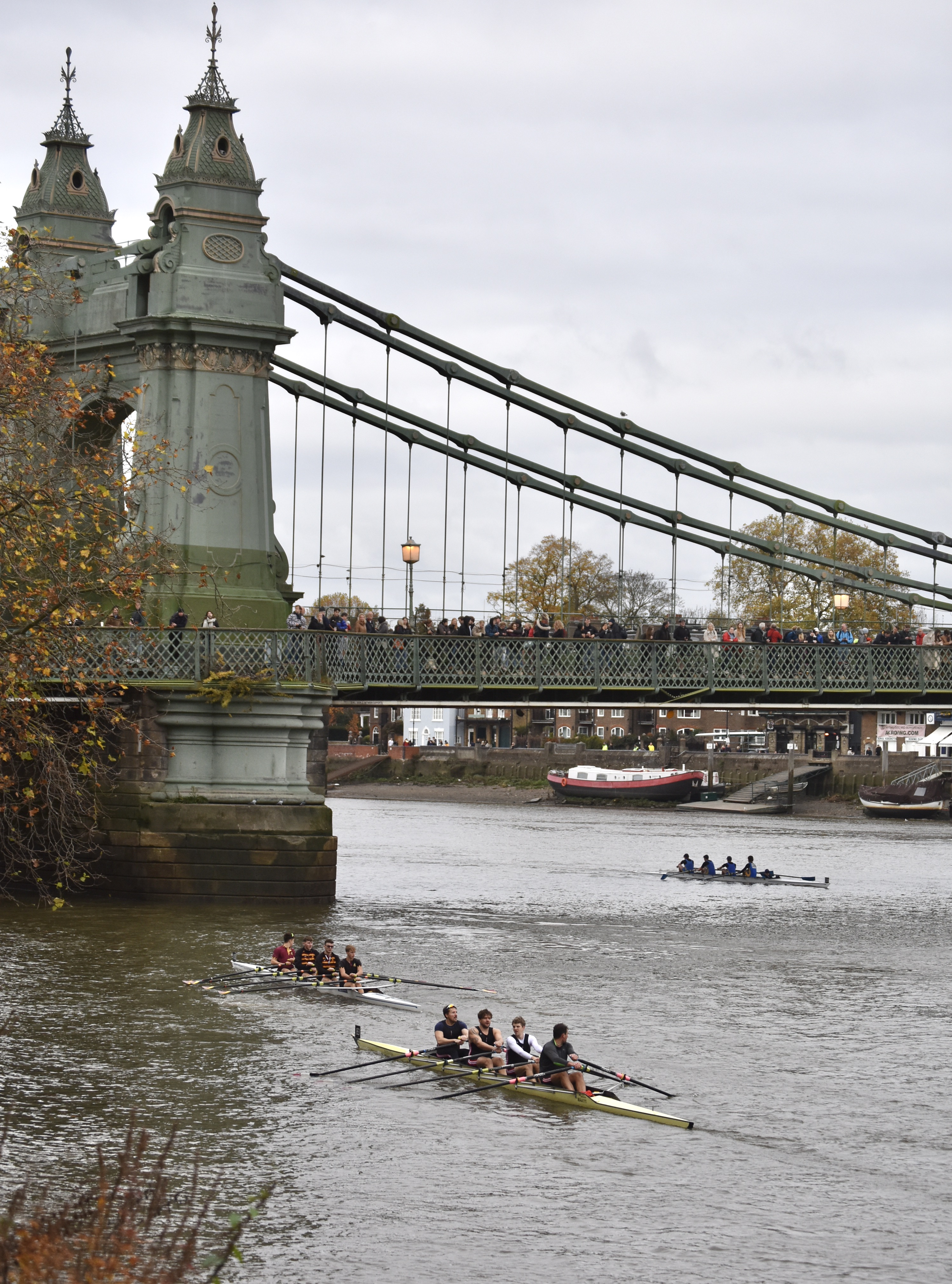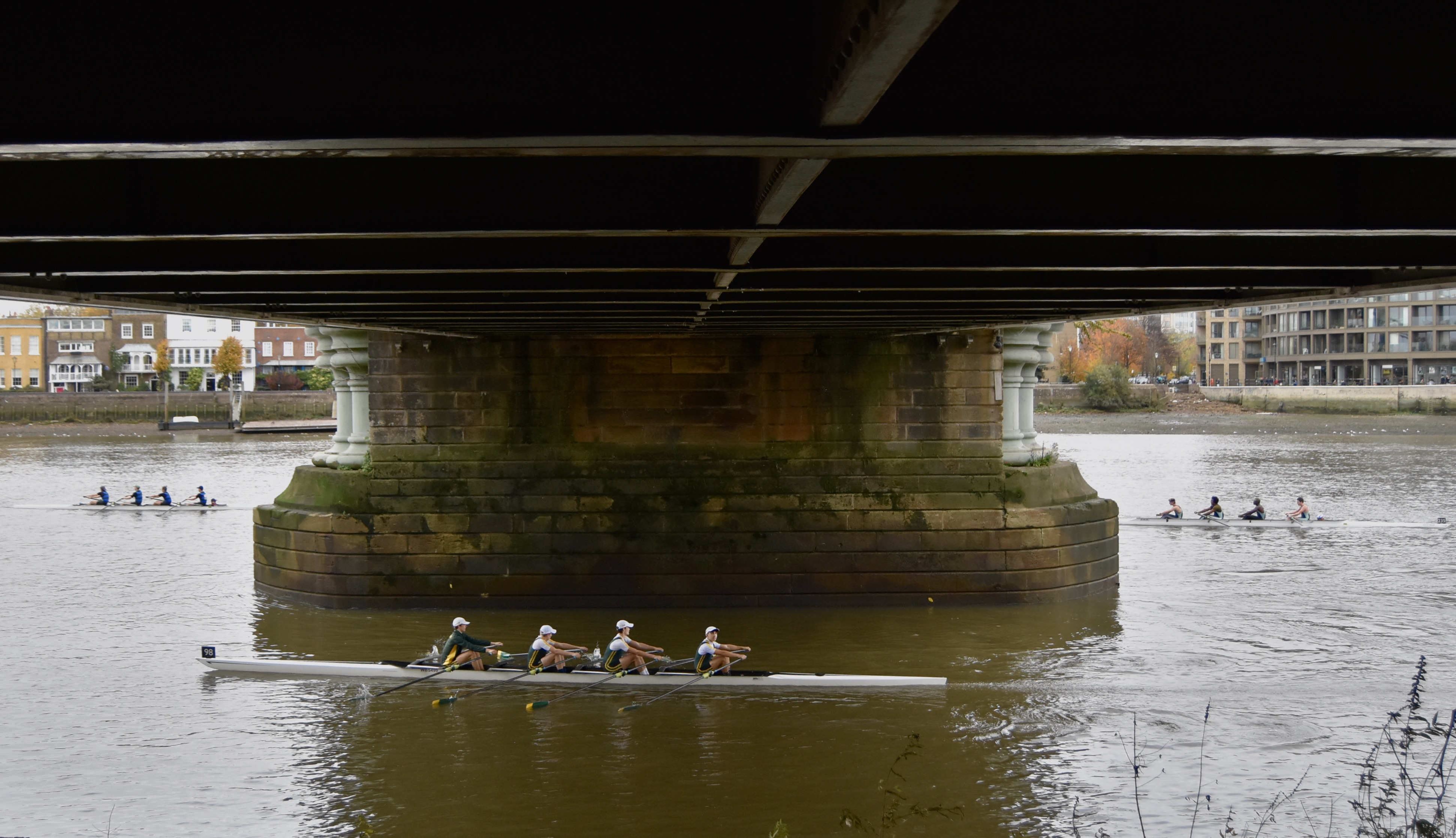 With 60% of the race done, St Edwards School A (Open School/Junior 4+) passes under Hammersmith Bridge.