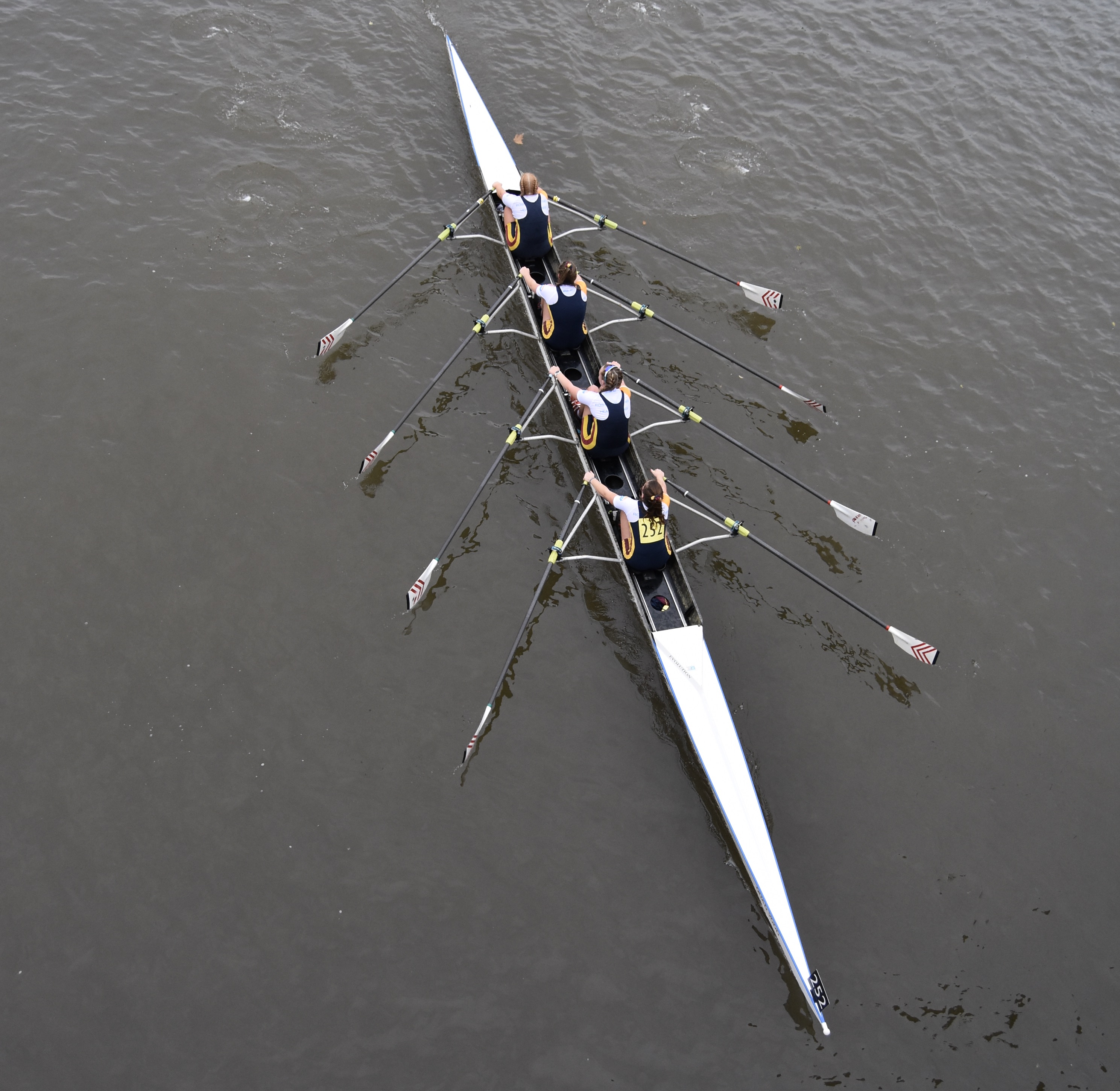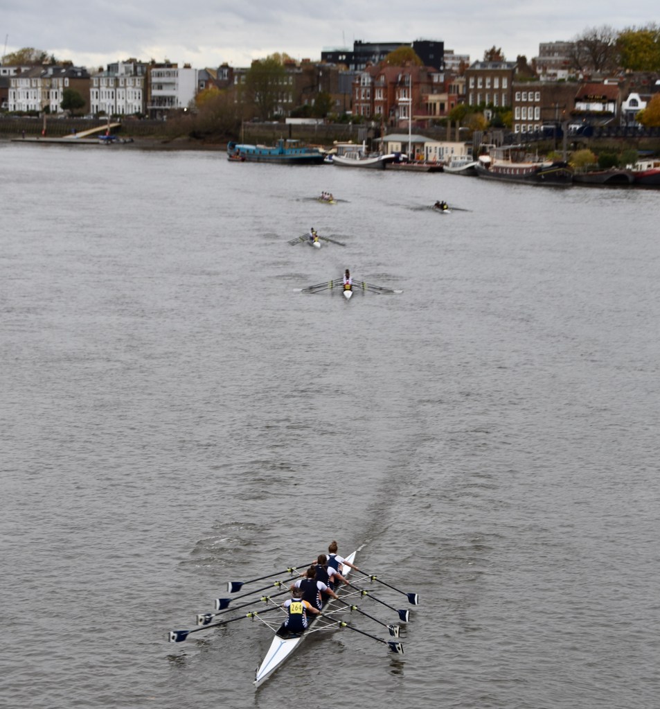 Looking down from Hammersmith Bridge on Imperial College London B, eventual winners of Women’s Academic 4- in a time of 20.47.9.