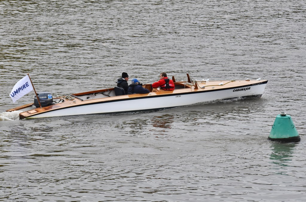 The Fours Head Chief Umpire and HTBS contributor, Daniel Walker (in red), follows the last boats down the course.