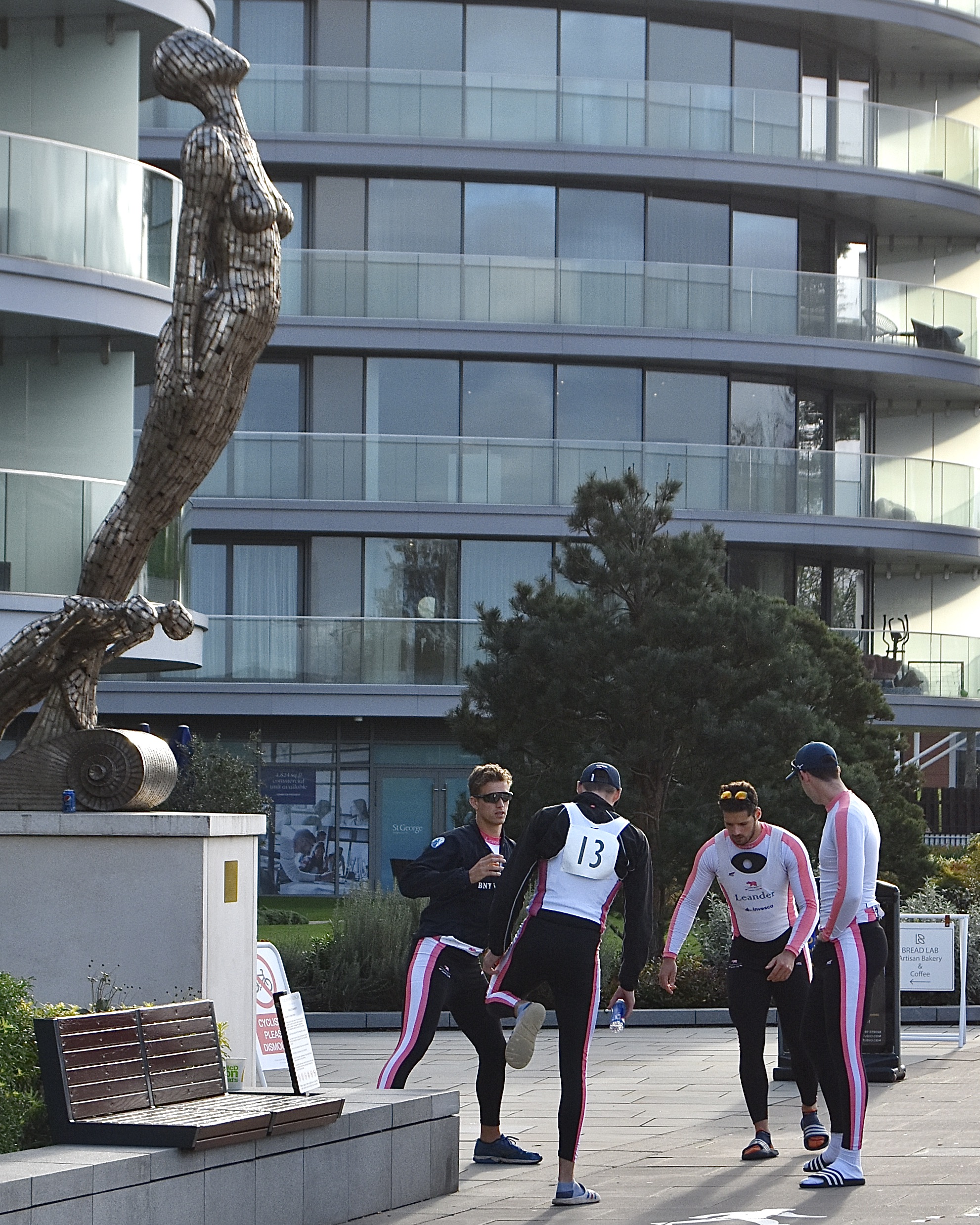 Leander J, entered in Open Championship 4-, indulging in a stretching session, one perhaps inspired by the statue on the left.