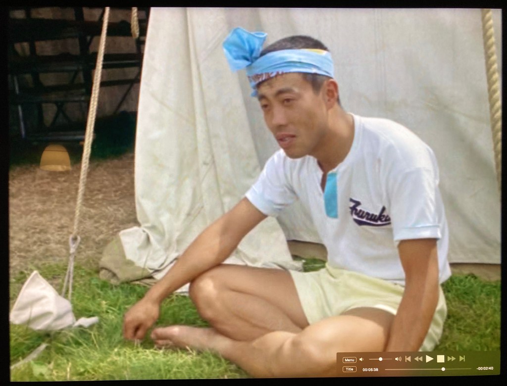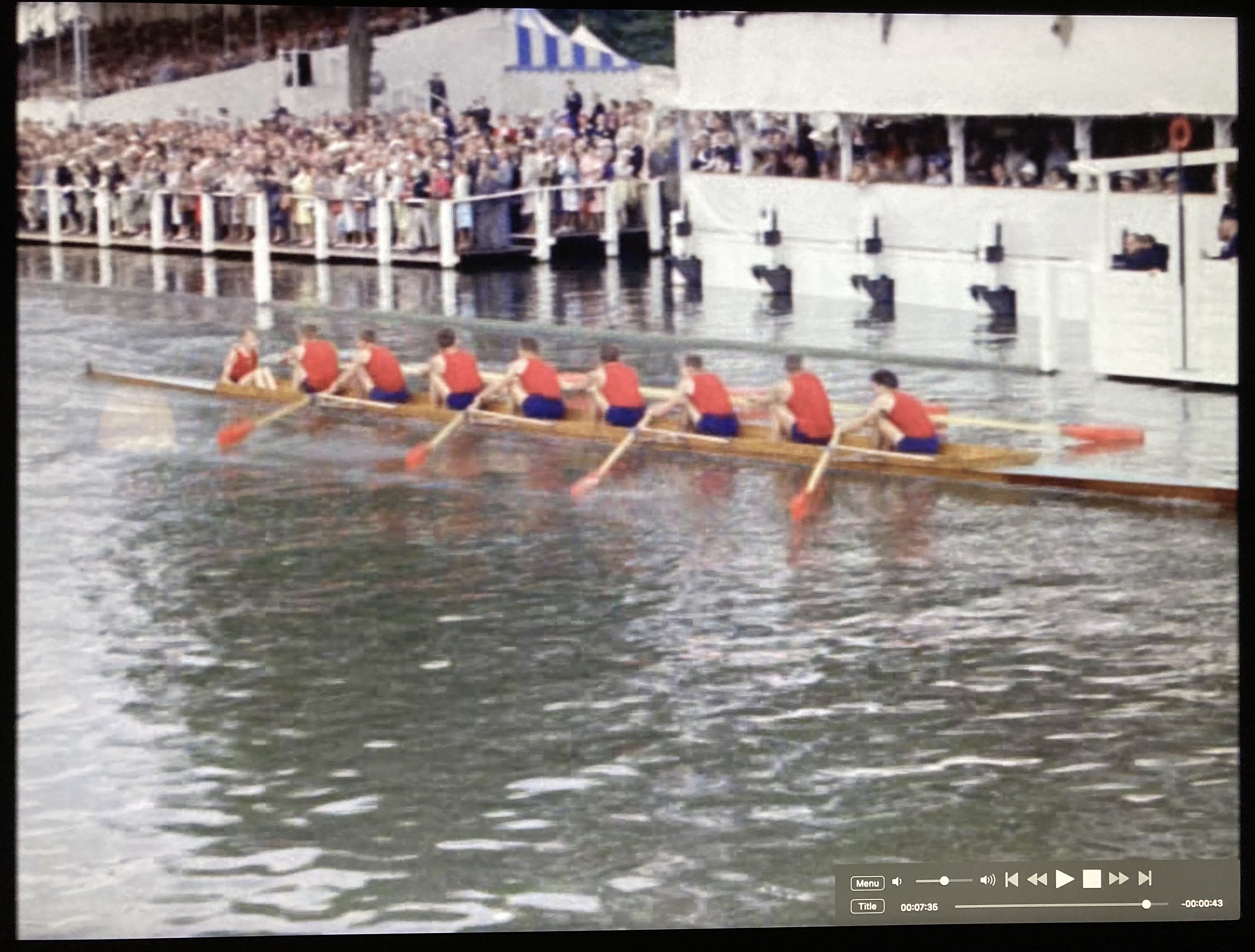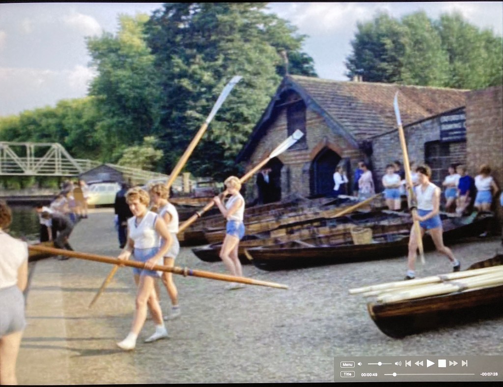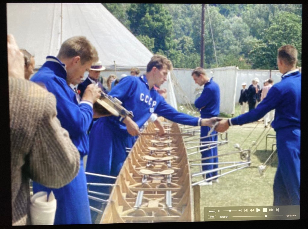 Shots follow of local crews rowing upriver through the locks to Henley. “But others” the narrator tells us “must come from as far afield as Japan, America and Russia”.