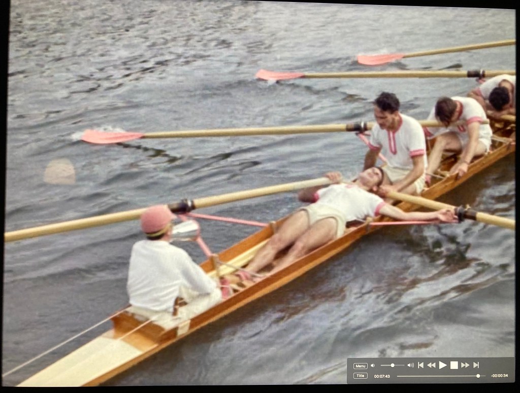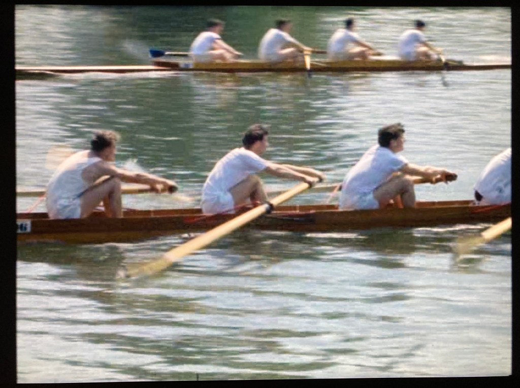 On their way back from Salford, the Oarsmen crew visited Nottingham in the English Midlands and took some shots of members of Nottingham and Union Boat Club self-consciously polishing their trophies outside their boathouse, the voiceover saying that they have never won at Henley, “the ambition of every oarsman”. Cut to a shot of a Notts and Union coxless four beating a Henley Rowing Club crew at Marlow Regatta in preparation for racing in the Wyfolds at Henley.
