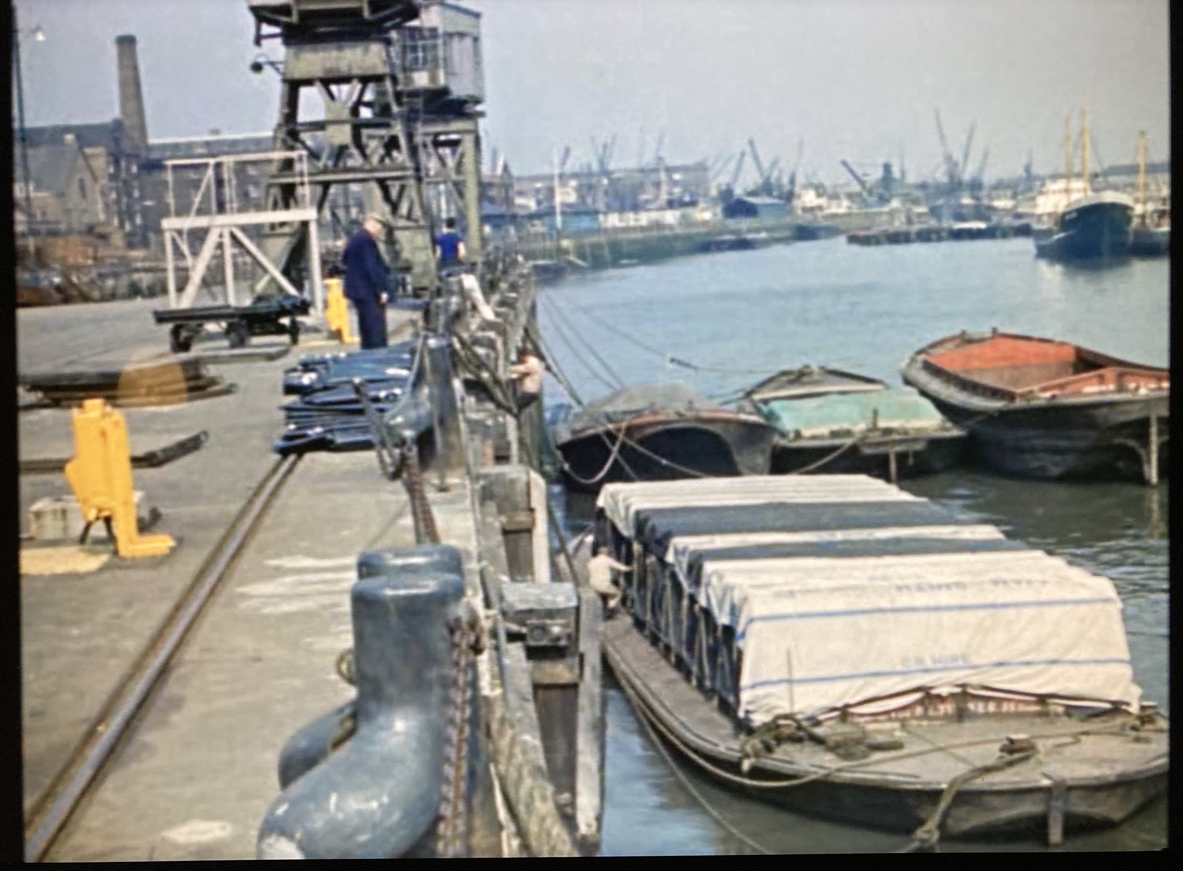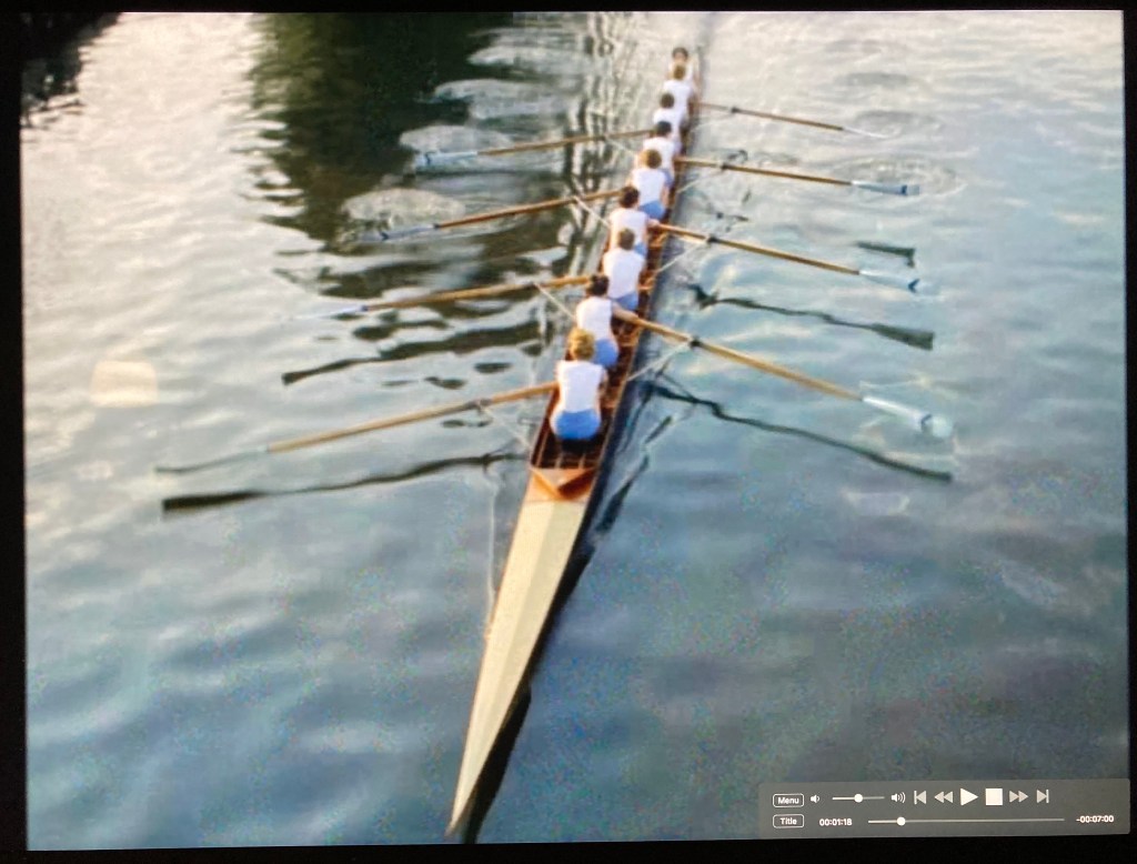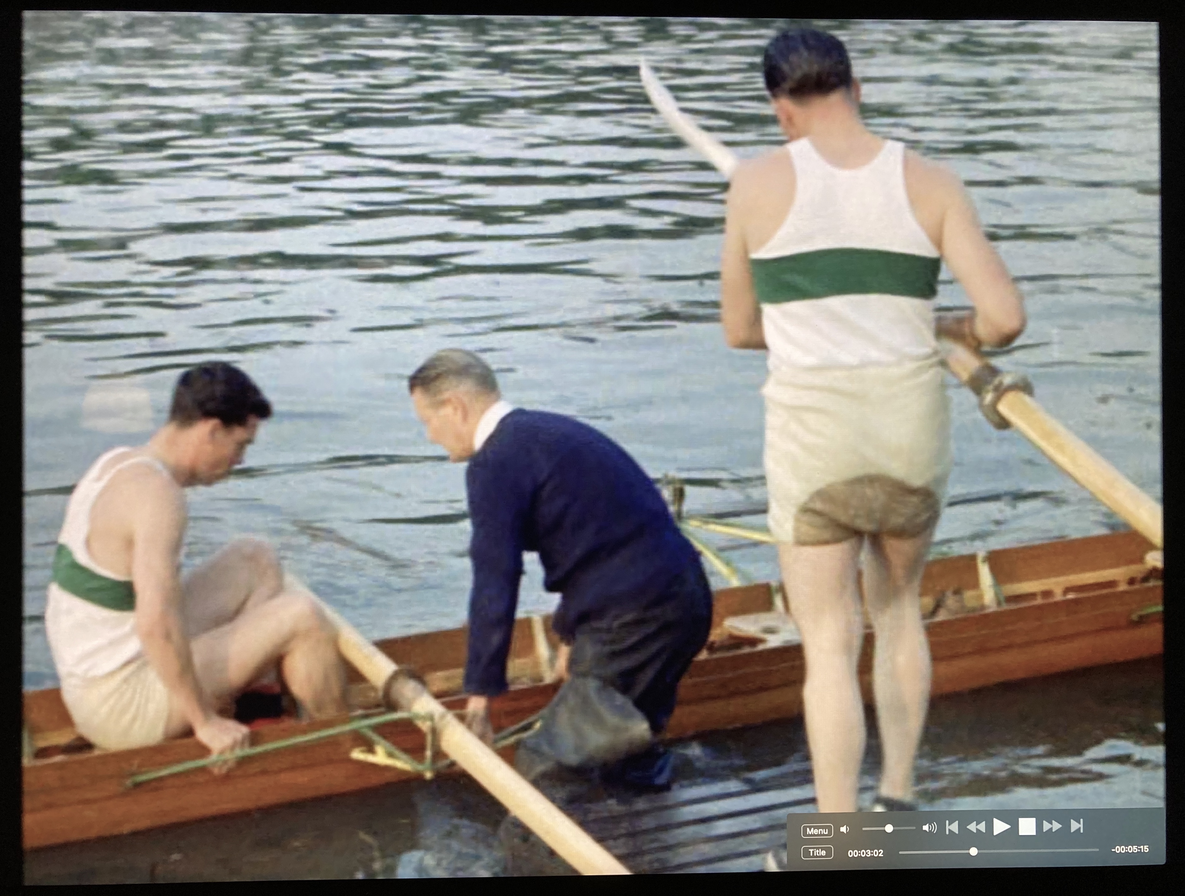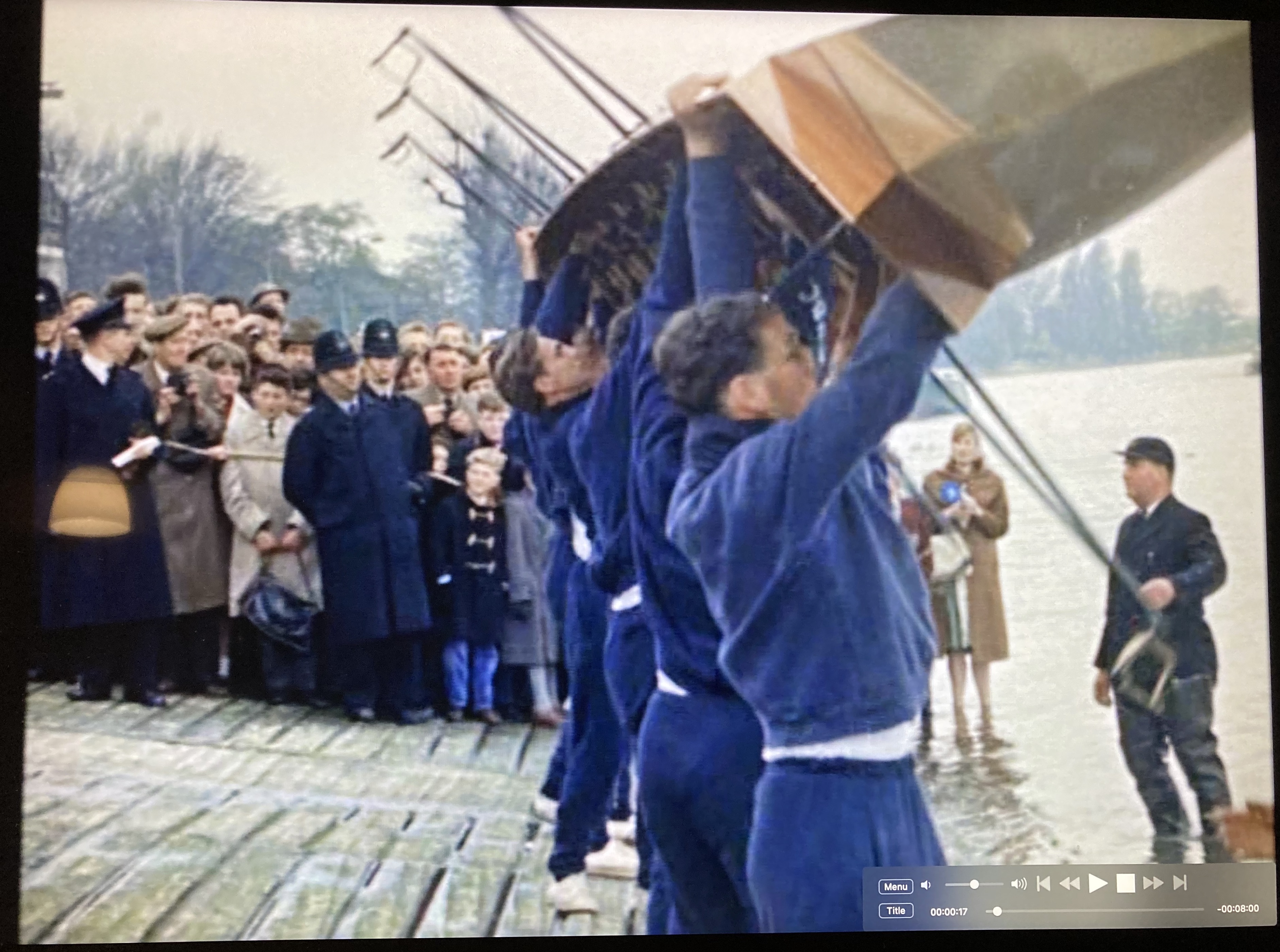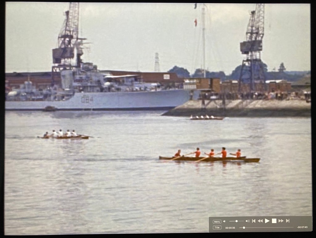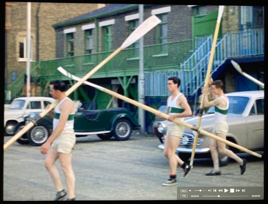Cut to shots of the Argosies’ Wyfold Four going afloat from the Putney Embankment in London. An “argosy” is a merchant ship, and the Argosies Rowing Club was formed under the auspices of the National Dock Labour Board as part of its sport and recreation activities. The Board was concerned with ending casual labour in dock work.