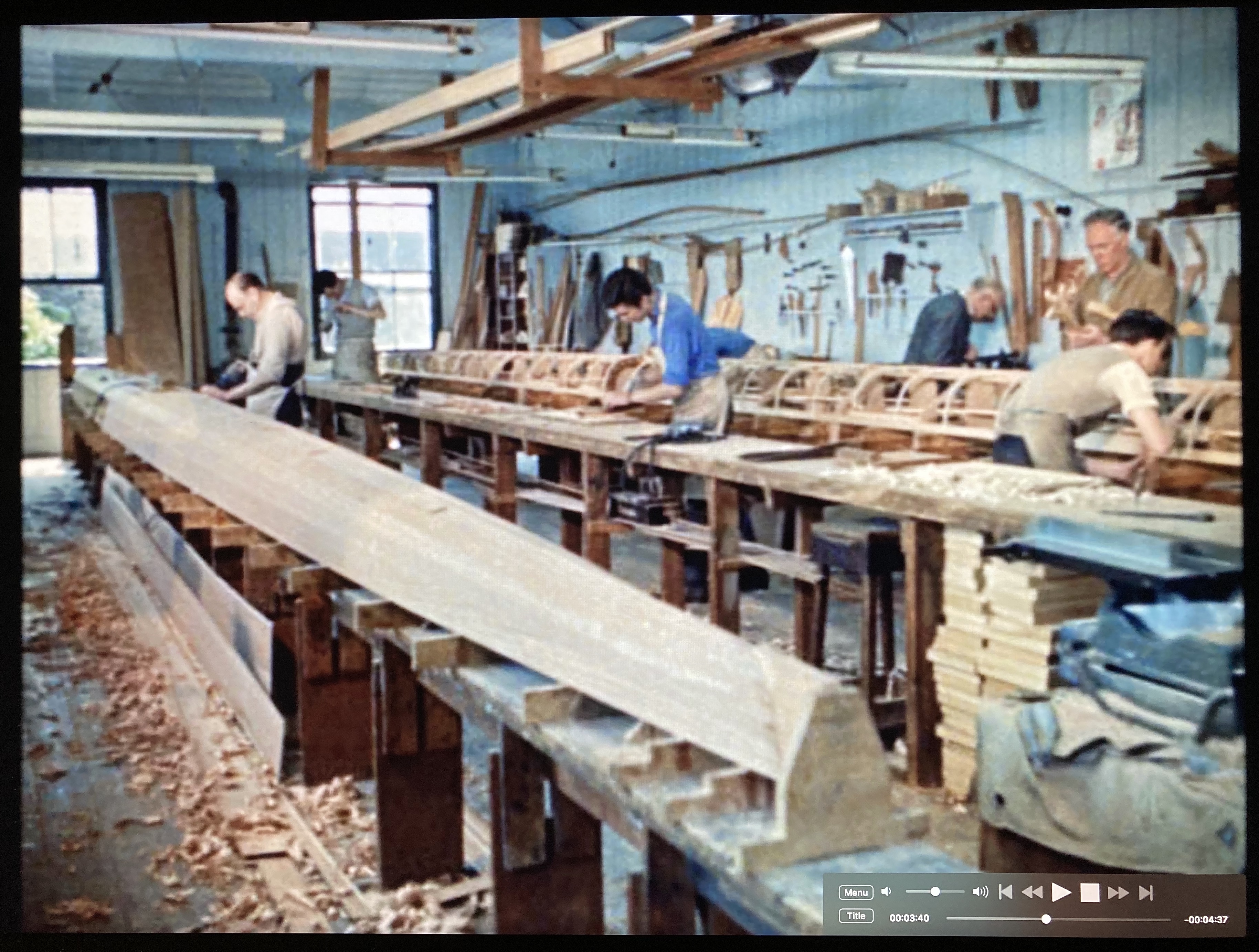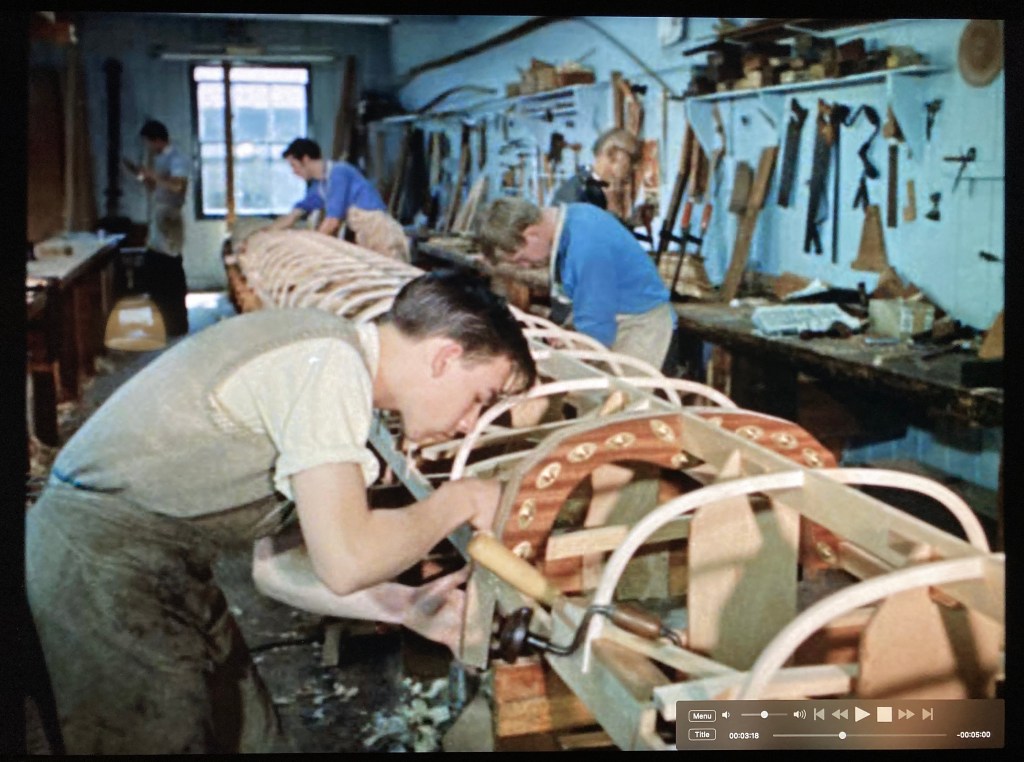 From Putney, the film crew made the short upriver trip to Hammersmith and to the Rutland Boathouse, a boatbuilders sited behind what is now Auriol Kensington Rowing Club (though, more importantly for the boatmen, it was also next to the Rutland Arms pub). Boatbuilder “Young” Bill Colley recalls that the building was erected in the 1880s by the famous boat firm of Biffen and that many Oxford – Cambridge Boat Race craft were made there. Since at least 1933, it had been run by various people called Sims, though not all related: George, Bill and Frankie (there was also Roland Sims who built boats at Putney). The last boats that came out of the Rutland were made by Young Bill Colley in the early 1970s.