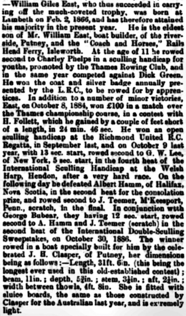 The “Wm East Boatbuilder” sign also provides a none-too-subtle clue to the identity of the sculler. I hold that it is William East’s son, William Giles East (1866 – 1932), a well-known and respected professional sculler and coach.