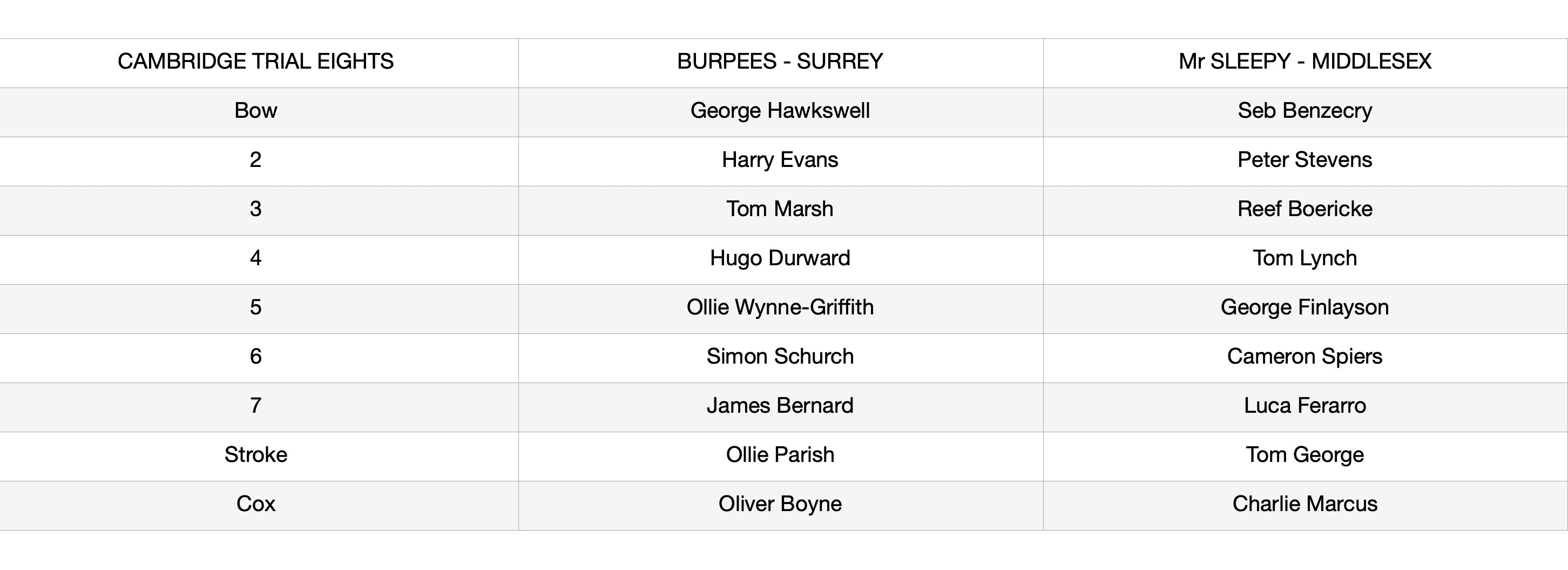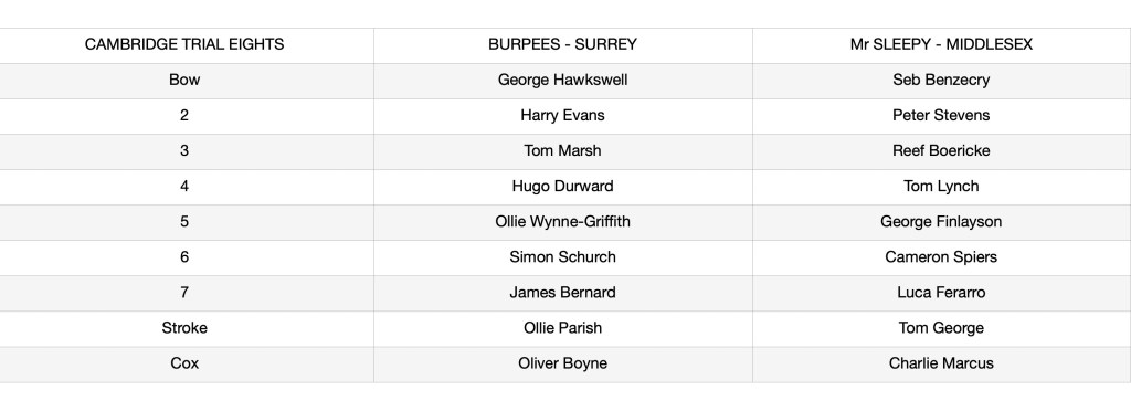 The CUBC Men’s Chief Coach, Rob Baker (left) and Old Blue James Cracknell (right).The final crews (the crew list on the video is not as they lined up). New Zealand Olympian Jamie Hunter, who was expected to stroke one of the boats, is injured. Mr Sleepy on Middlesex was stroked by Tom George, Bronze Medalist in the GB Eight at Tokyo, and a man with a 2k of 5.39.6. Burpees on Surrey had another GB Eight Tokyo Bronze Medalist Ollie Wynne-Griffith at “5” plus Swiss Olympian Simon Schürch, at “6”.