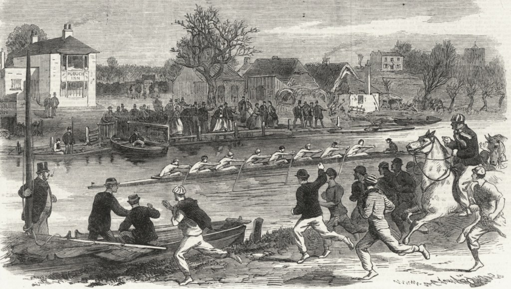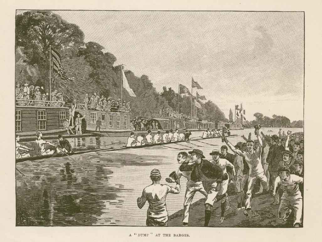 Bumping on the Isis c.1840. The first such race at Oxford was in 1815 and at Cambridge in 1827. Bumps originated because neither the Cam nor the Isis are particularly suitable for side-by-side racing.