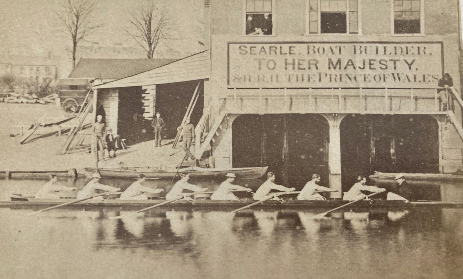 A crew, possibly from Trinity College, on the Cam in the early 1860s.