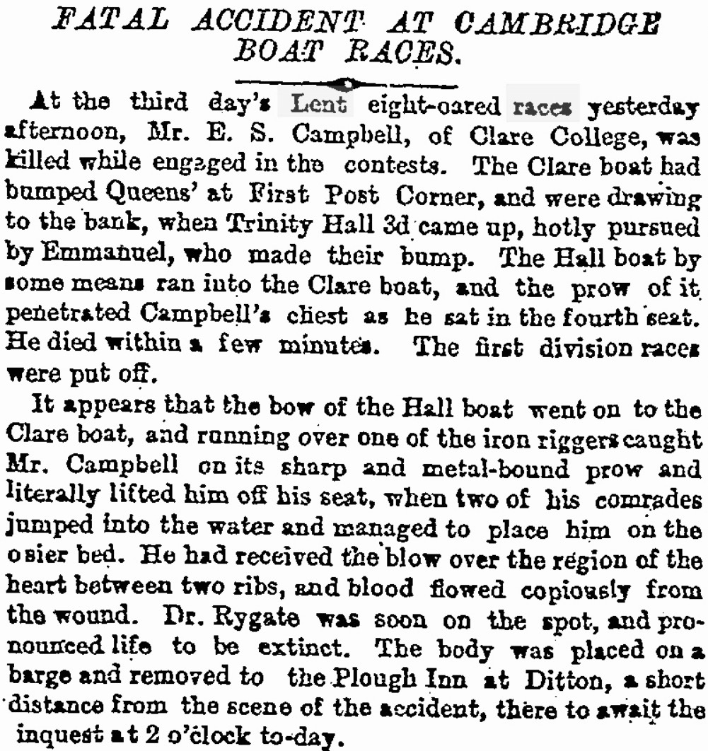 The third day was the occasion of a sad tragedy. Clare bumped Queens’, and drew into the bank by Grassy. Behind these boats was the Trinity Hall third boat. This, instead of rounding First Post Corner, ran, by some mishap, across the river, and the nose of the boat struck number 4 in the Clare boat just over his heart, killing him on the spot.