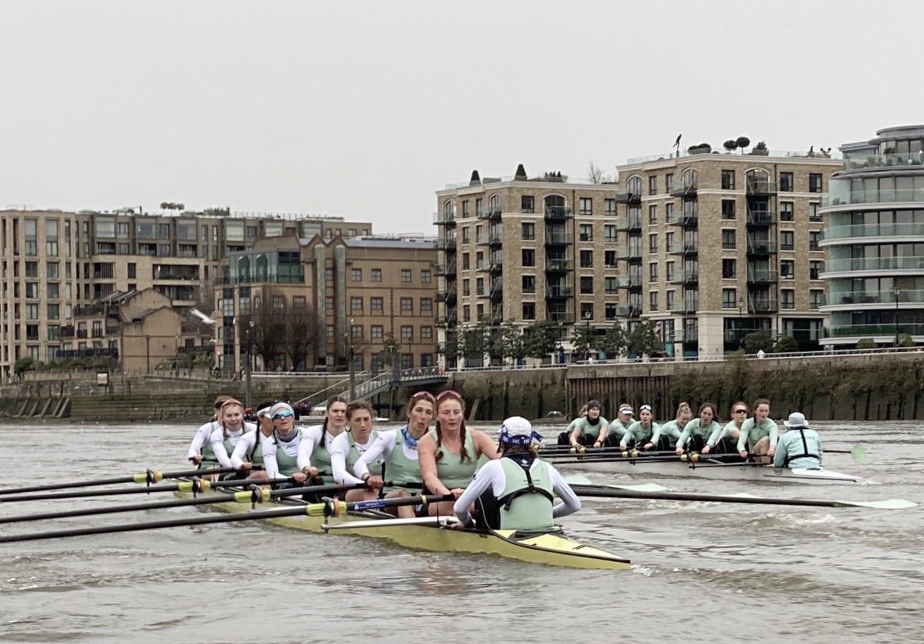 The Cambridge Women’s trial race, due to be held on 21 December along with the men‘s, was delayed due to a case of COVID within the squad but finally took place on 6 January. Due to the rescheduling, there was no live stream or press boat but there were tweets from the umpire’s launch, and I managed to take a few pictures standing opposite Harrods.