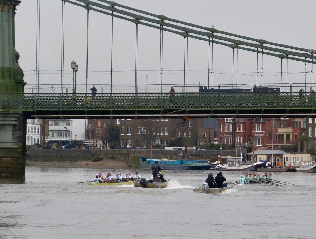 Along Fulham Reach. According to the Tweets up to that point, Woody led off the start but was warned by the umpire. At Barn Elms, Woody was 1/2 length up and had extended this to “almost a length” at the Mile Post. Picture: @theboatrace
