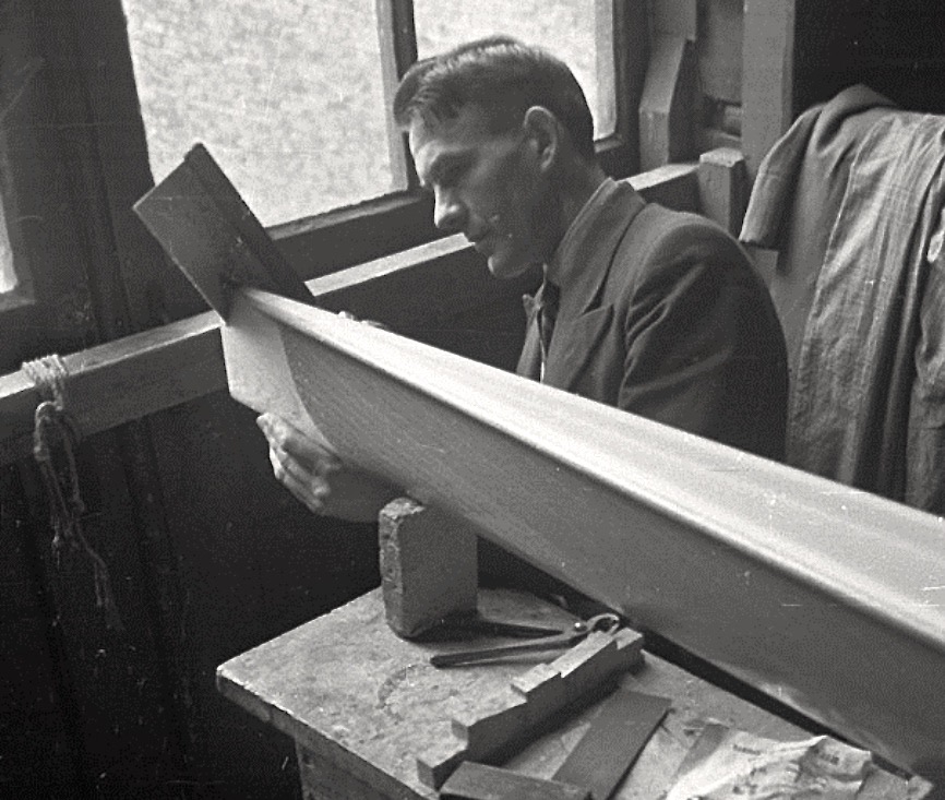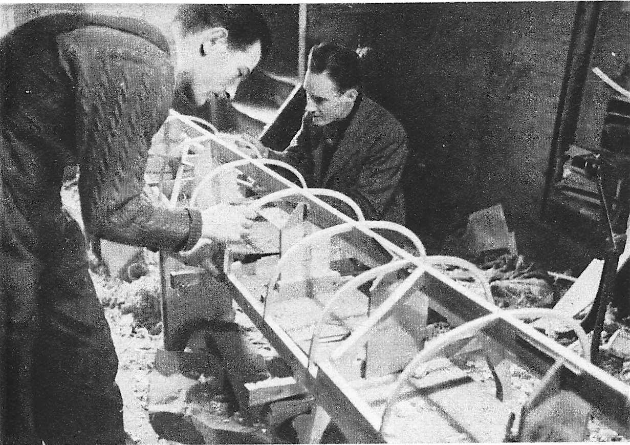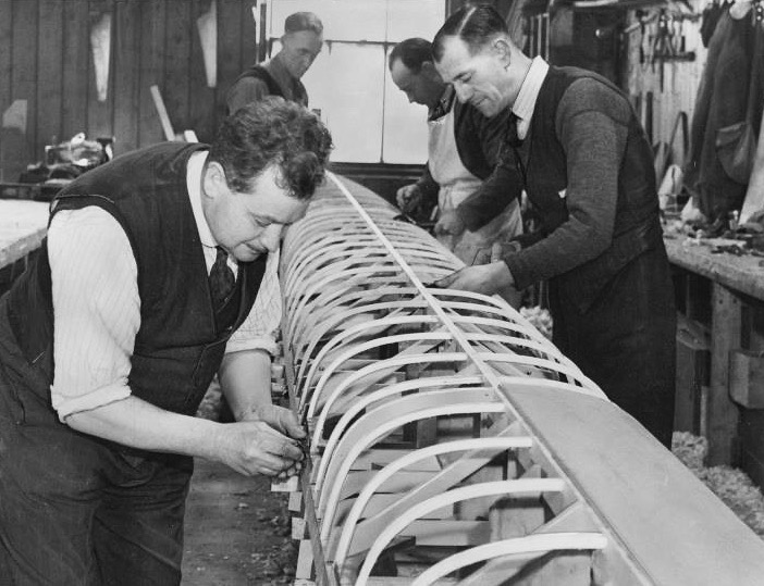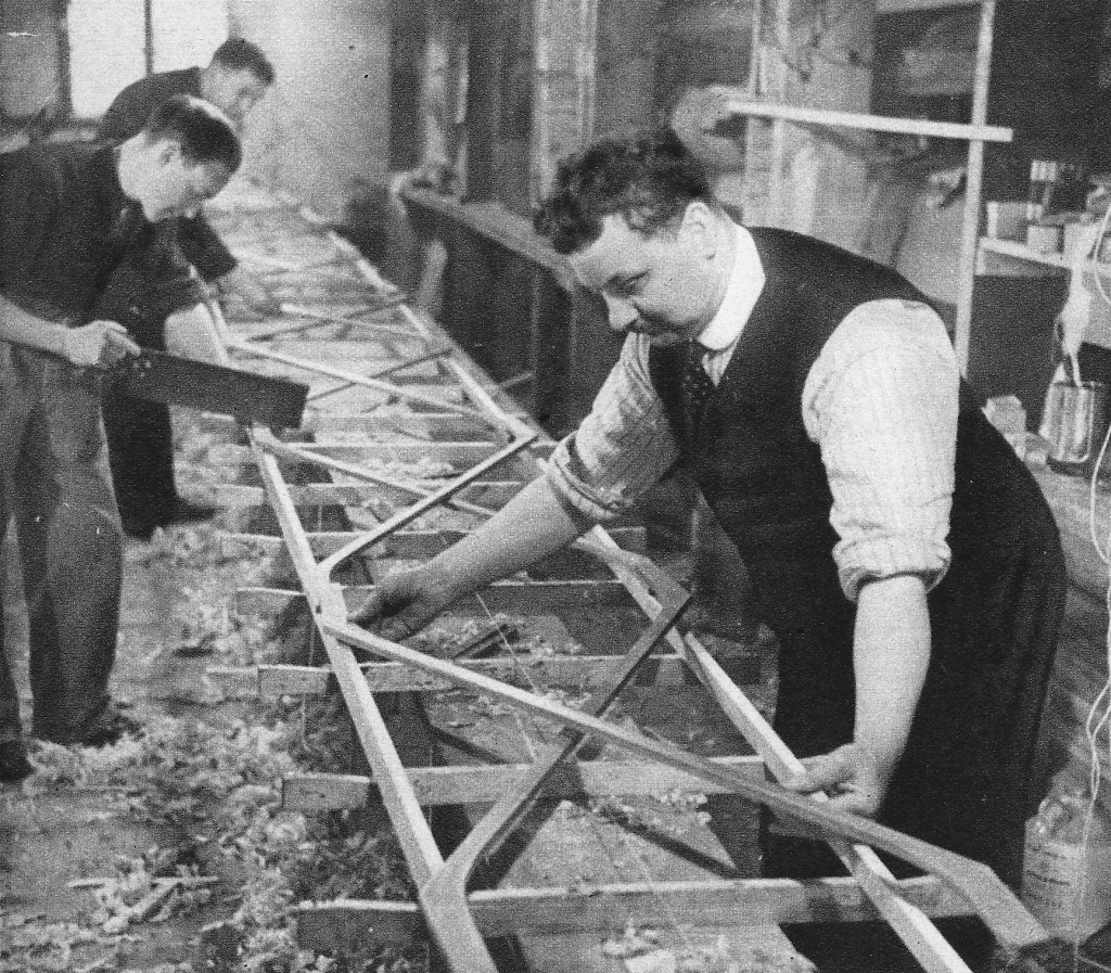 George Sims (left) and others engaged in building a wooden eight in Hammersmith’s Rutland Boathouse in 1947.