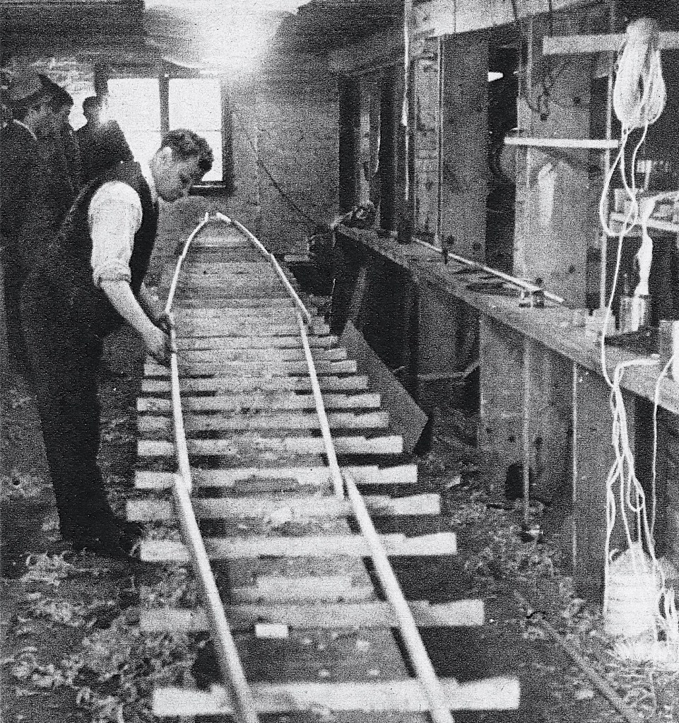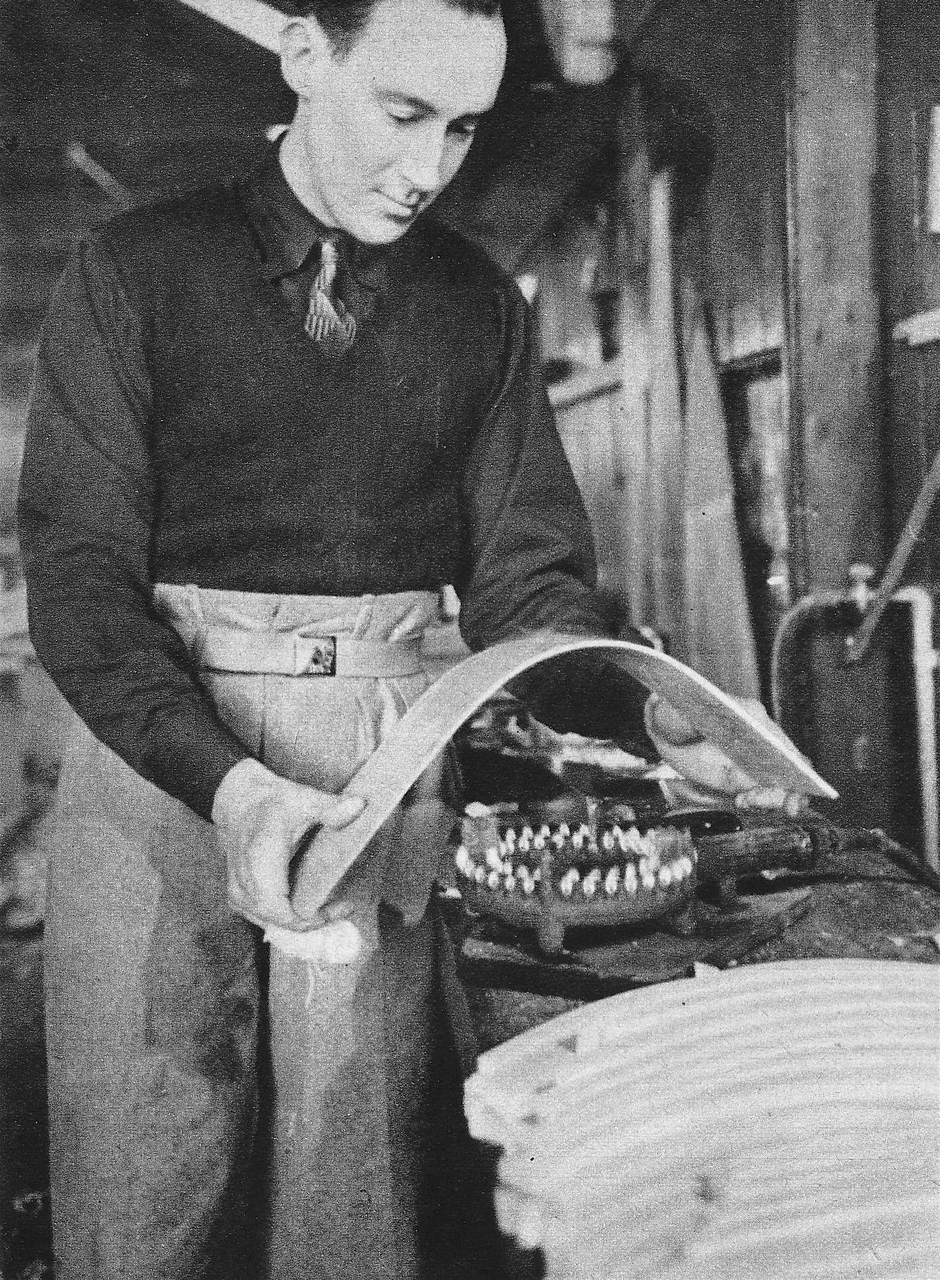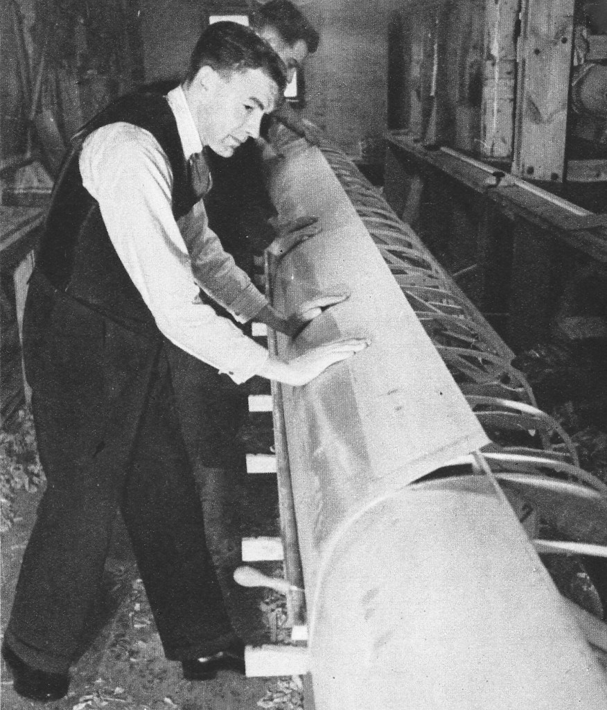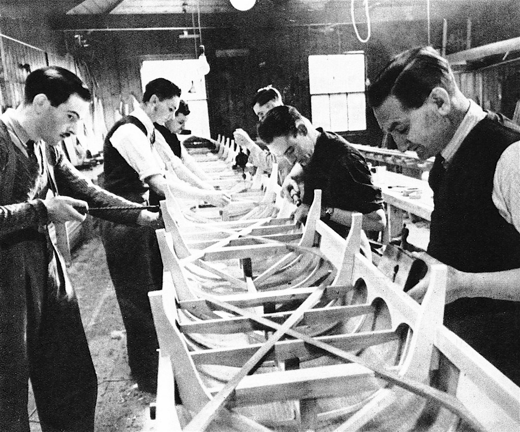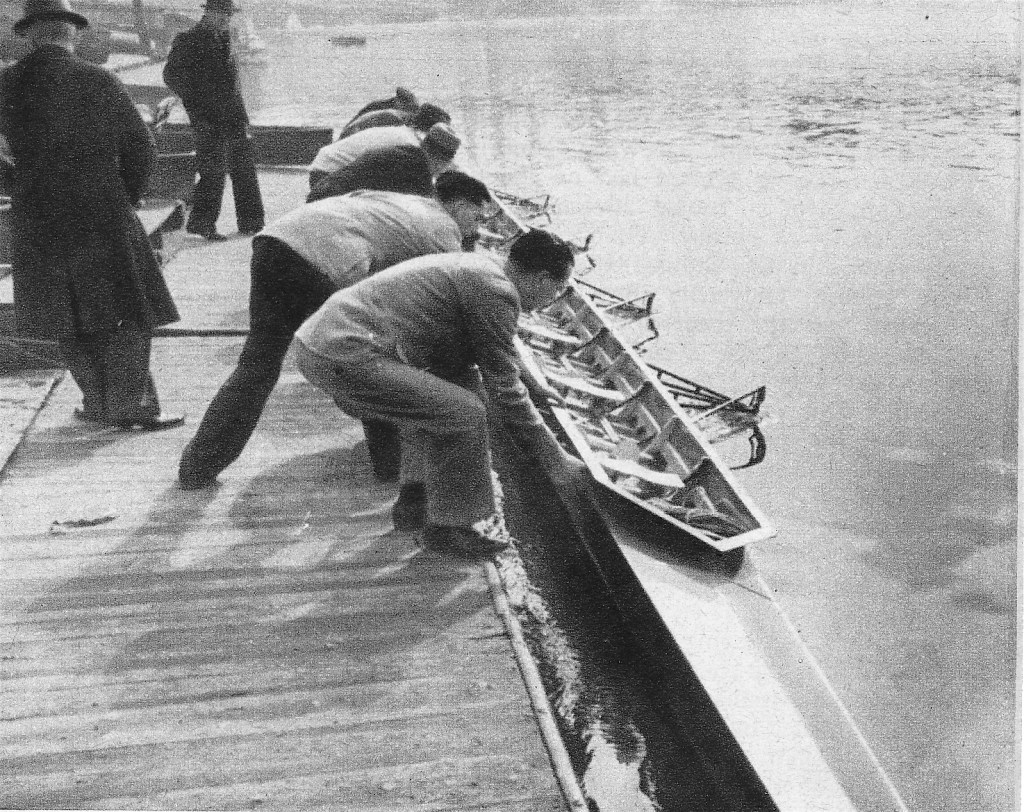 Laying down the gunwales.Building in the mahogany braces.Marking out the ribs. The templates were based on previous boats.Dropping in the keel.Fitting the ribs.Dampened planking (lengths of cedar wood 3/16 inch thick) is bent to shape over a gas ring.More shaping of the planking over a row of gas jets.Adjusting the planking before finally nailing it down. About 3,500 copper nails were used in every eight.Boatbuilding at the Rutland Boathouse was a family affair. In 1939, George (the son and grandson of boatbuilders) worked alongside his brother, his son and two nephews.Fitting the gunwales.Nearly finished. Together, the boat, oars and rowers weighed nearly 2,000 pounds – but the boat accounted for only 280 pounds of that.Eights were built on an upper floor of the Hammersmith boathouse and had to be passed down to ground level on completion.Fortunately, the Thames was only yards away…And the Rutland pub was even closer. Thirsty boatbuilders Christen their new baby.At Chiswick, Oxford are pictured taking their new boat out for the first time.